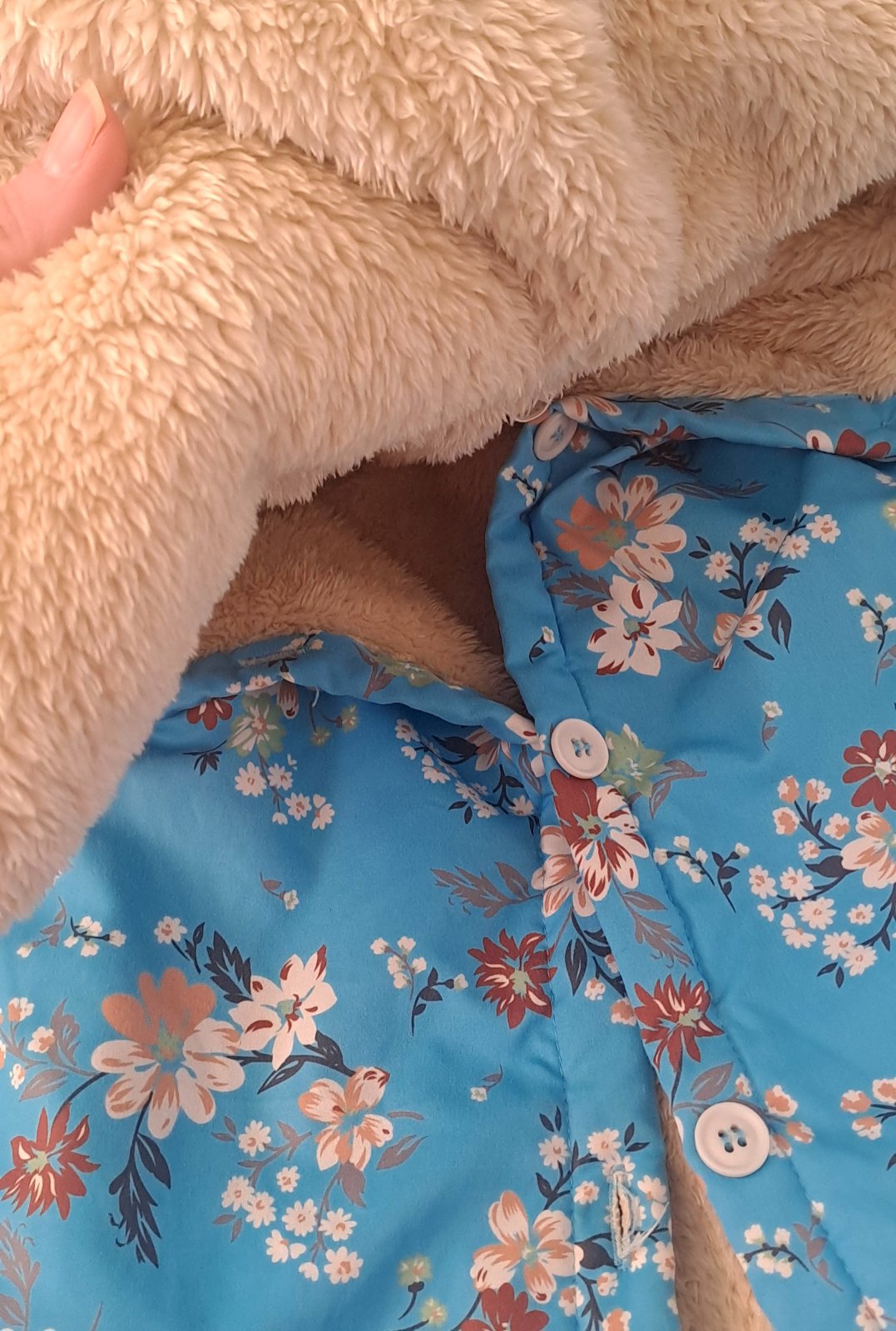 Zateplená bundička. Motív rozkvitnutých kvetov. Dĺžka 54 cm, rukáv 47 cm. Krásna 🌸🌸🌸 Vhodná na denné nosenie / škola, na turistiku - nepremokavá/. Kapucňa napevno. Veľkosť 128/ 134.