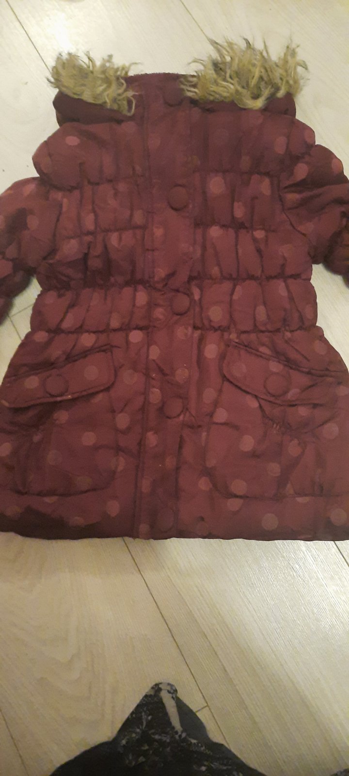 Dievčenská zimná bunda, teplucka, s kapucnou lemovanou kožušinkou.Bordová farba s potlačou vzor guličky.Velkost na 3 roky. Zachovalý stav.