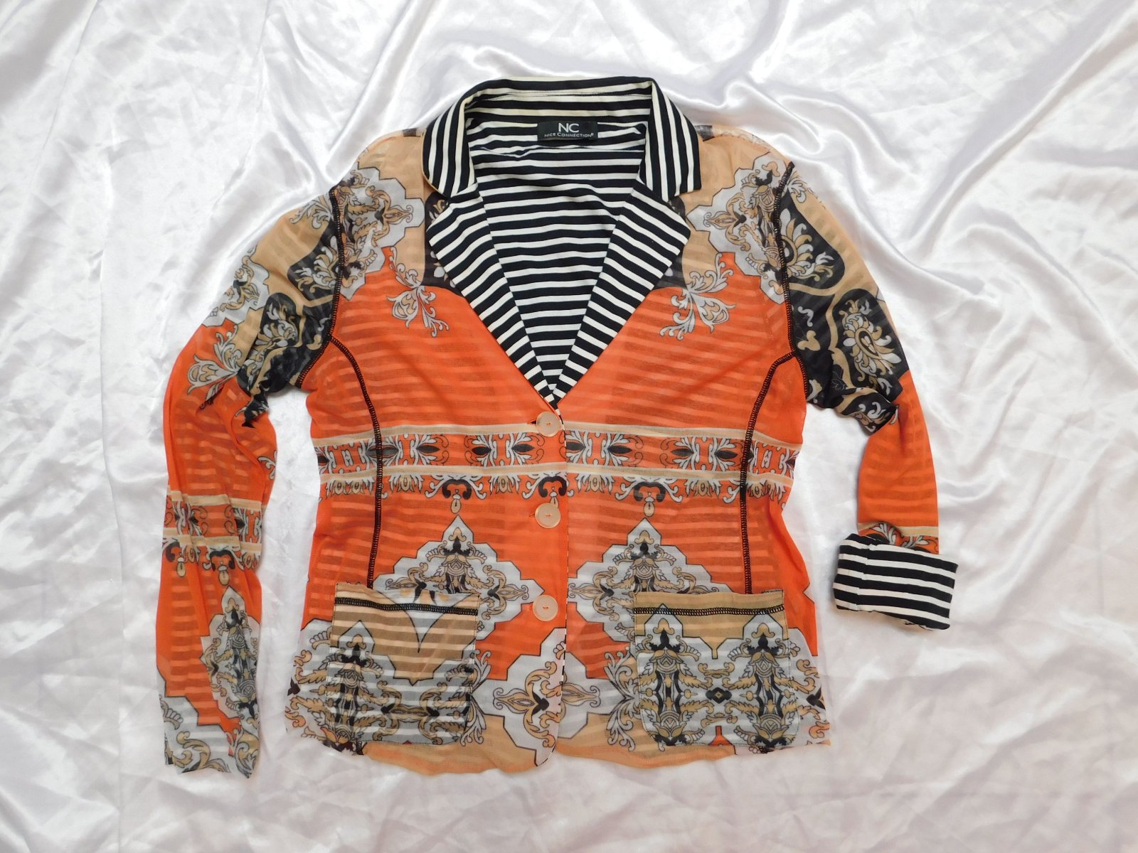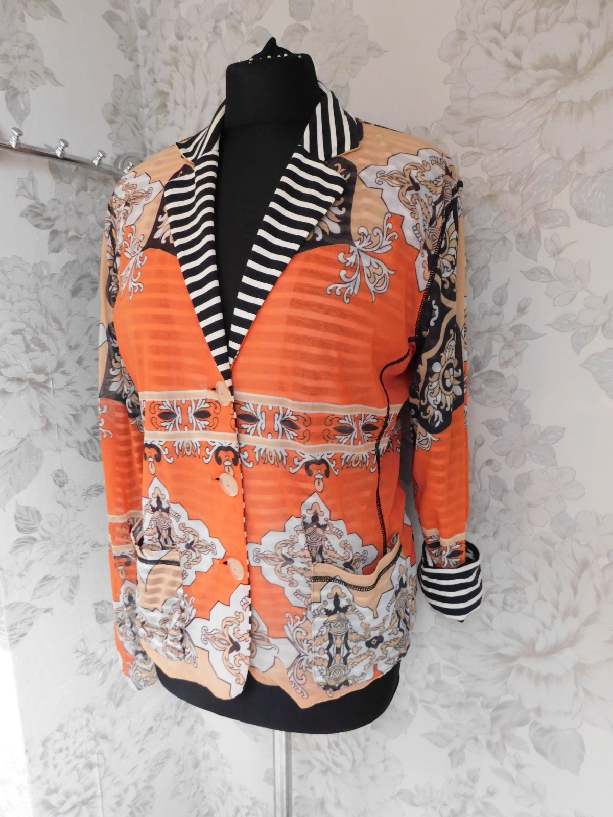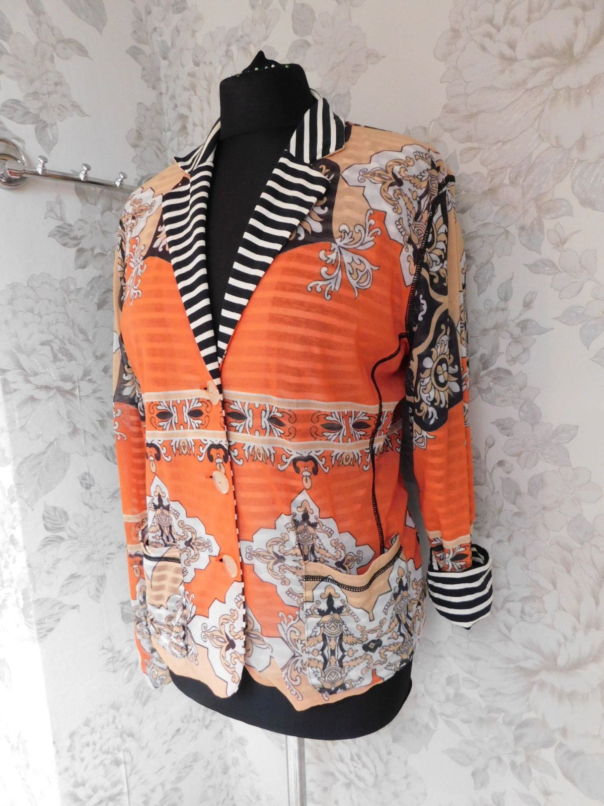 Luxusny trendy blejzer,s naročnym vzorom,zelastickeho materialu,s kontrasnou pasikovanou podšivkou.super stav ako novy. 100%polyamid,100%cotton. se29