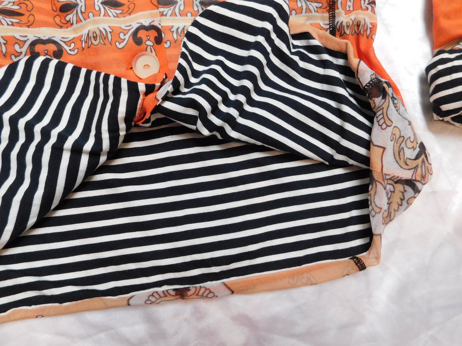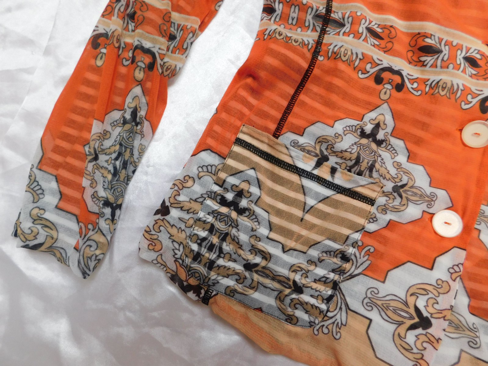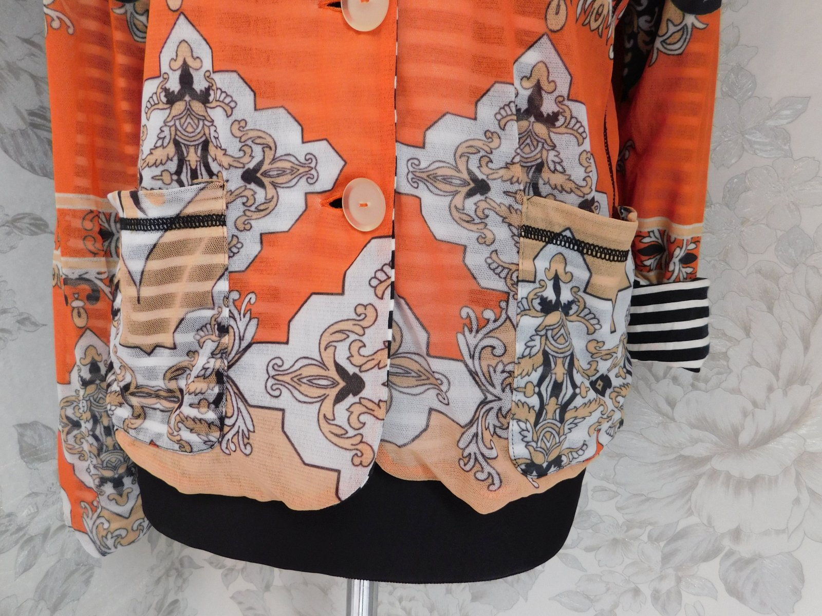 Luxusny trendy blejzer,s naročnym vzorom,zelastickeho materialu,s kontrasnou pasikovanou podšivkou.super stav ako novy. 100%polyamid,100%cotton. se29