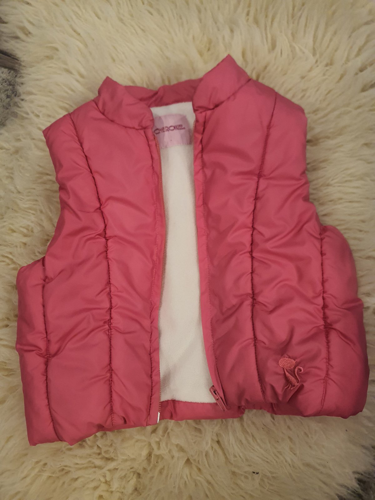 Predám detskú dievčenskú zateplenú vestičku ktorú sme nestihli vynosiť. Veľkosť 98, značka Cherokee. Na poslednej foto na štítku je fixkou písmeno N. Vestička je bez poškodení.