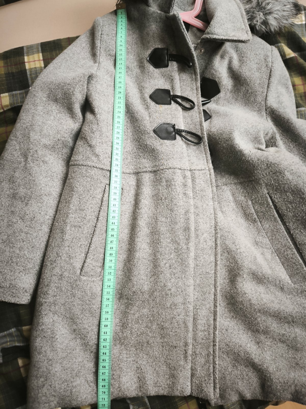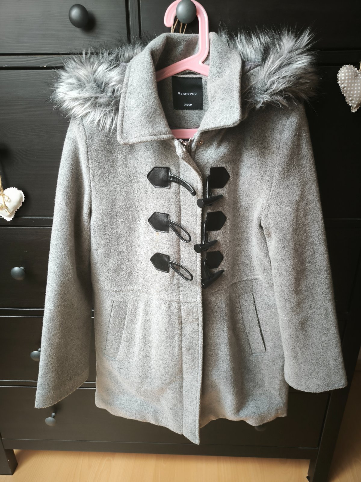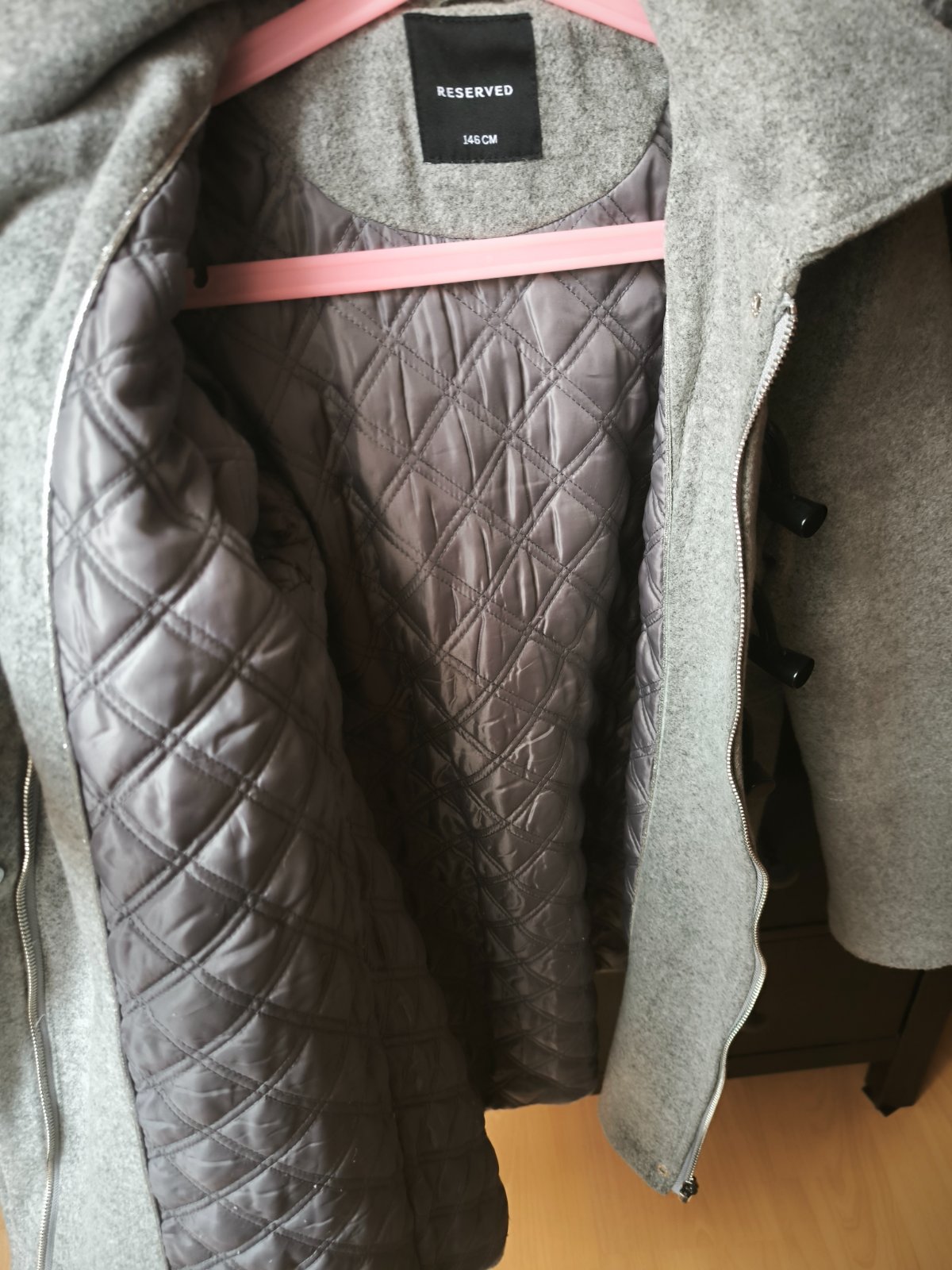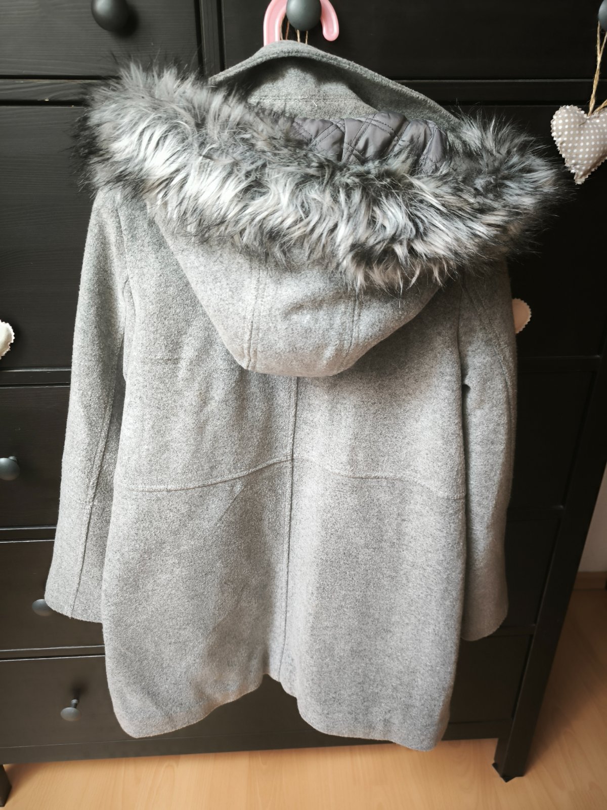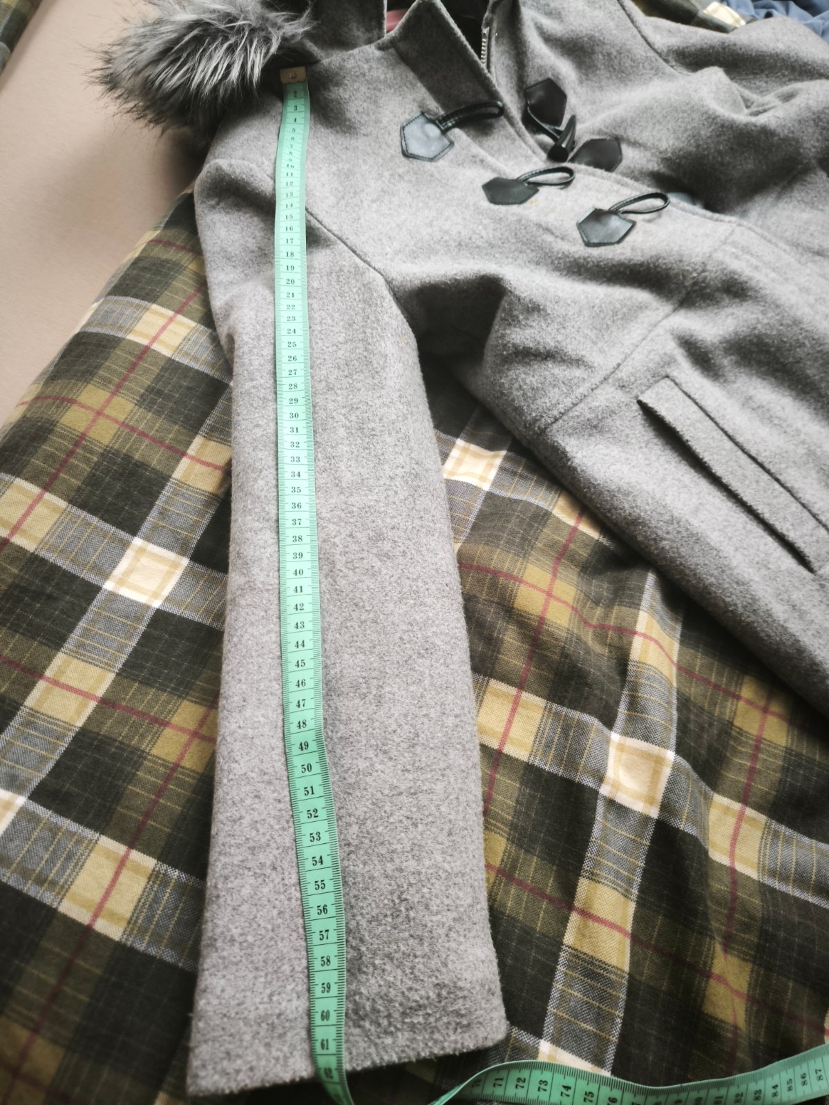 Krásny kabát, má skrytý zips po celej dlzke, krásne drží teplo. Podšity. Kapucňa napevno