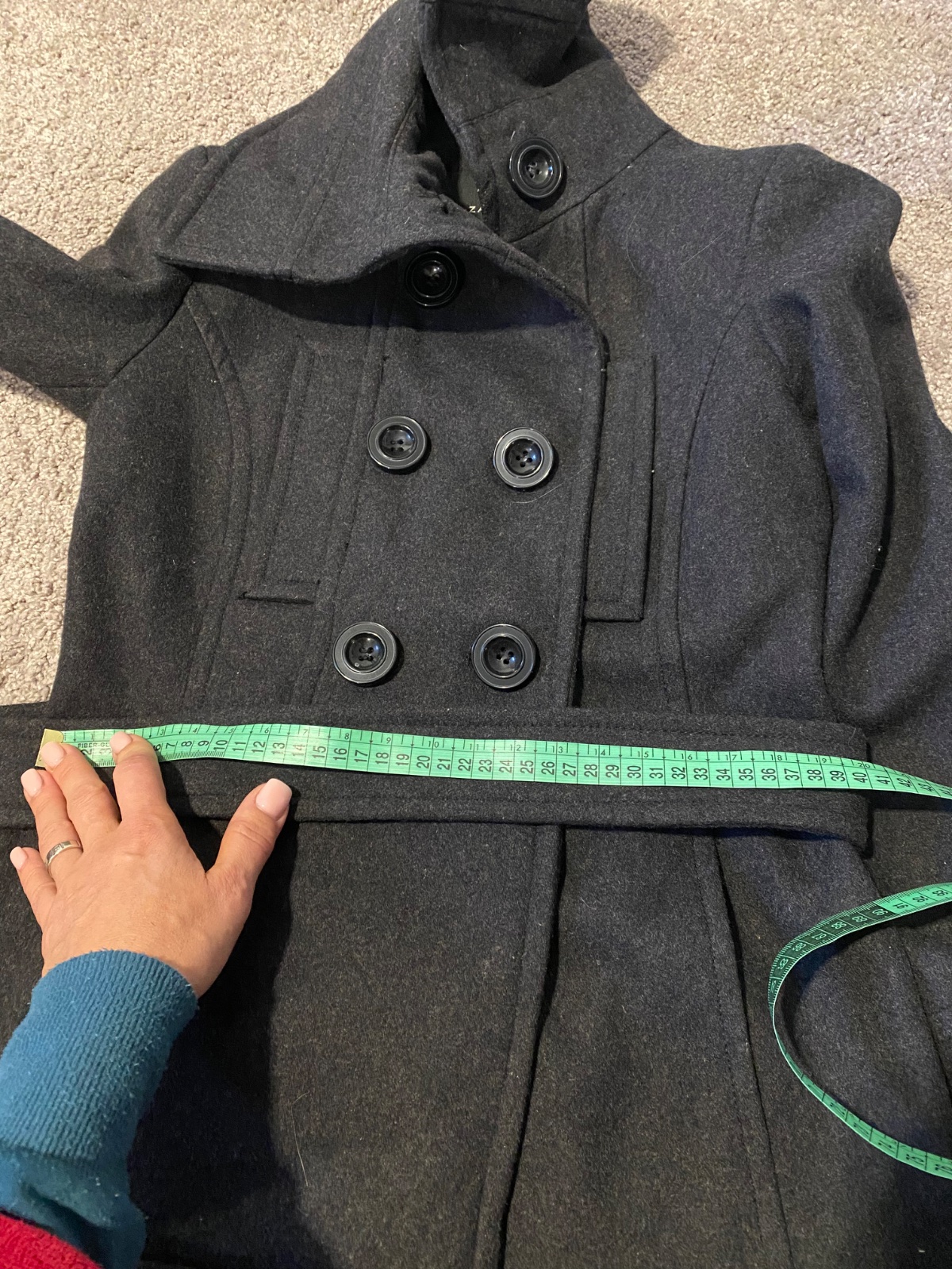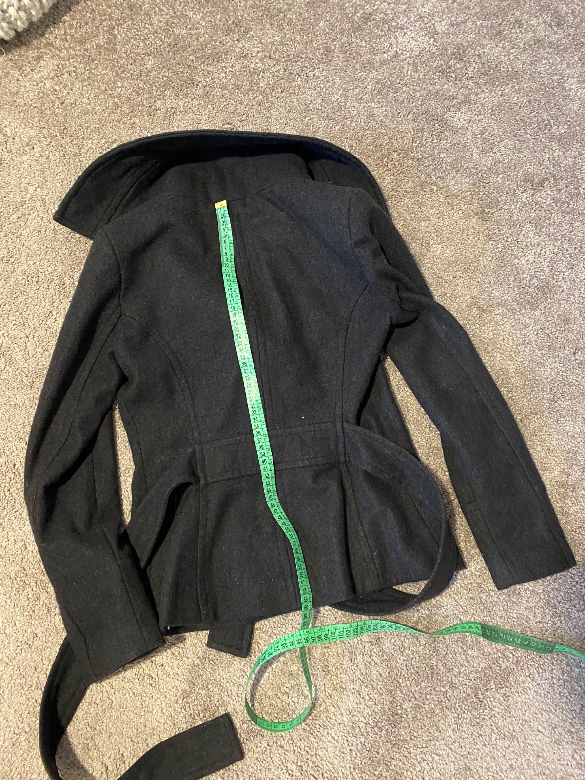 vo velmi dobrom stave,malo noseny,dlzka 60cm,dvojradove zapinanie,kapse na bokoch,pasik v pase