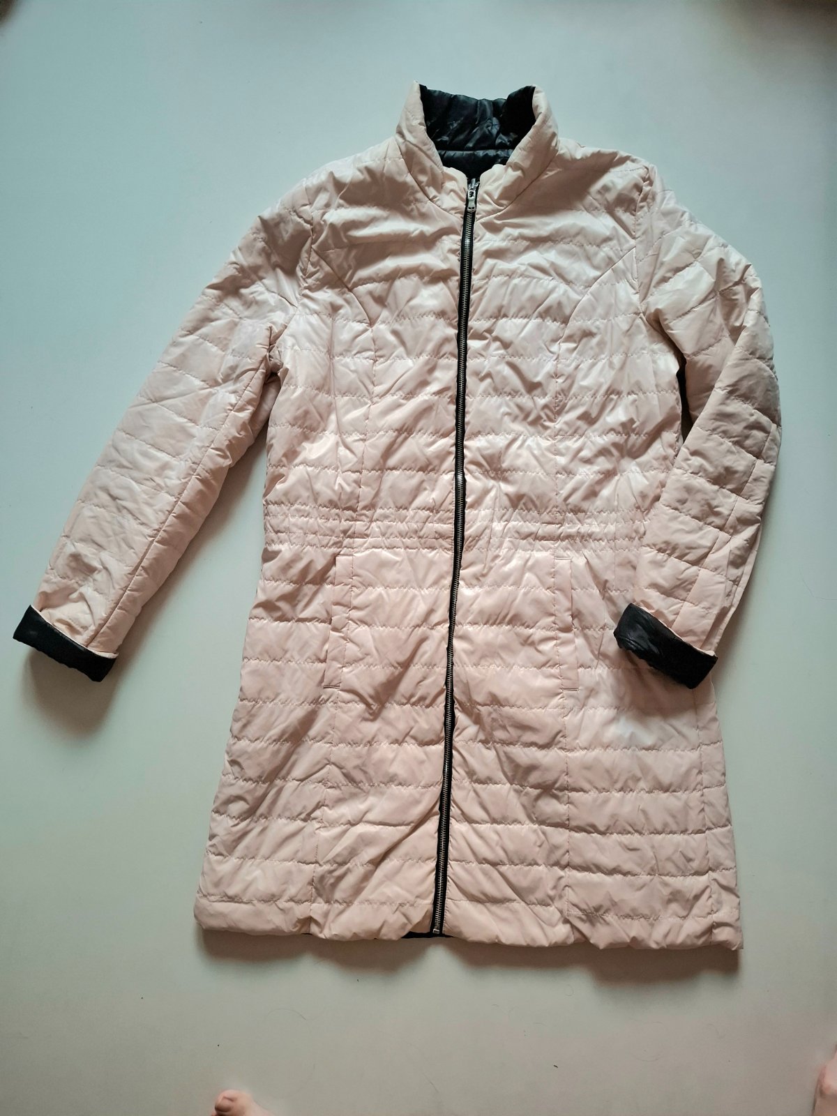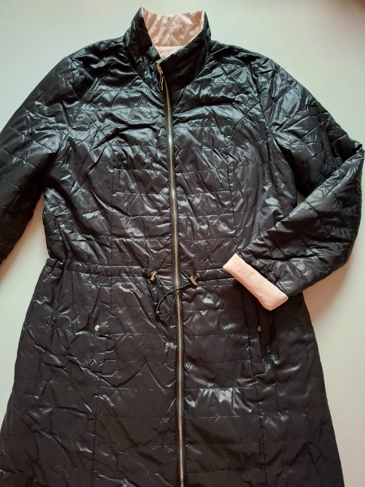 Tenšia dlhá bunda, obojstranná. Vrecká na obidvoch stranách.