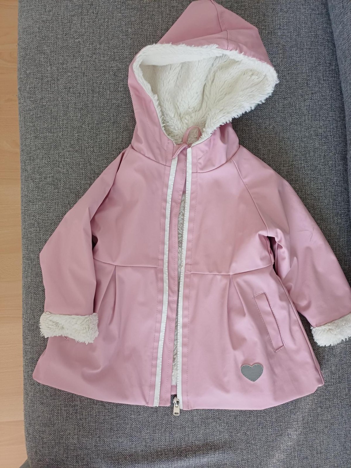 Zimna bunda,velkost 92, kapucna sa da odopnut(su tam cvoky) bunda ma sem tam zatrhnutia jemne a osuchane rukavy trosku, vsekto na fotene,inak stale pekna,na dvor ihrisko posluzi este