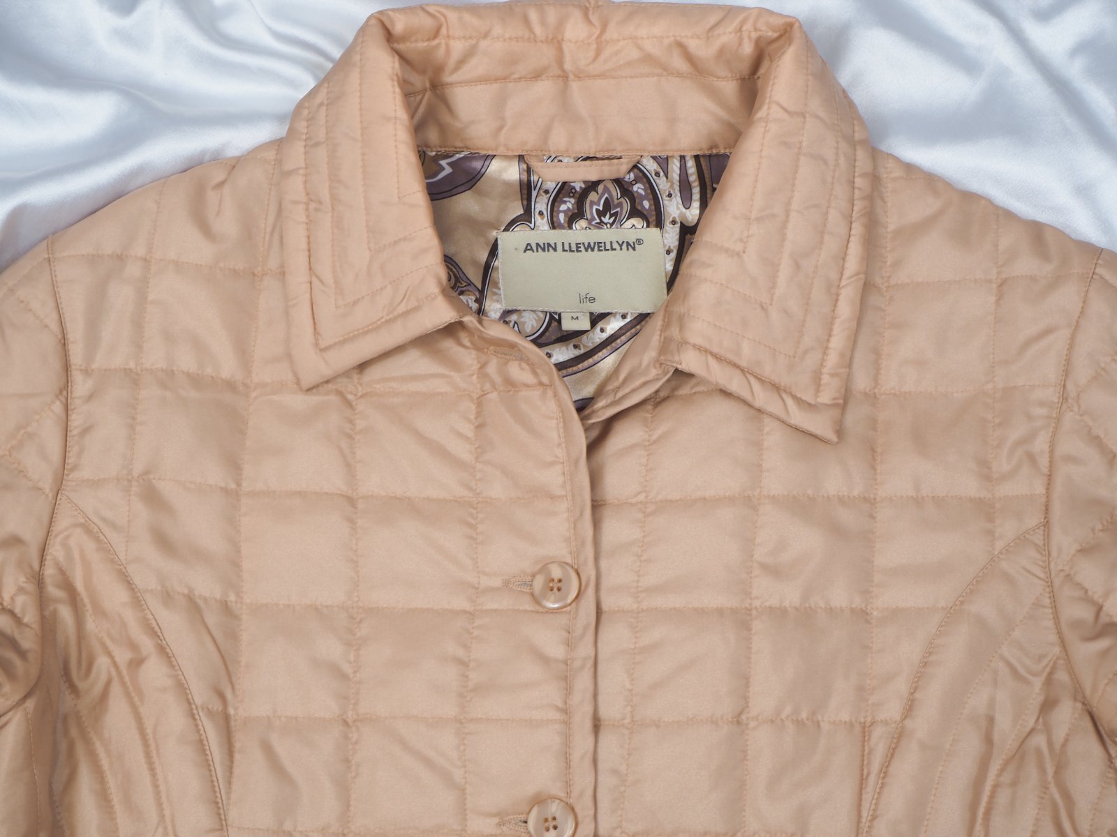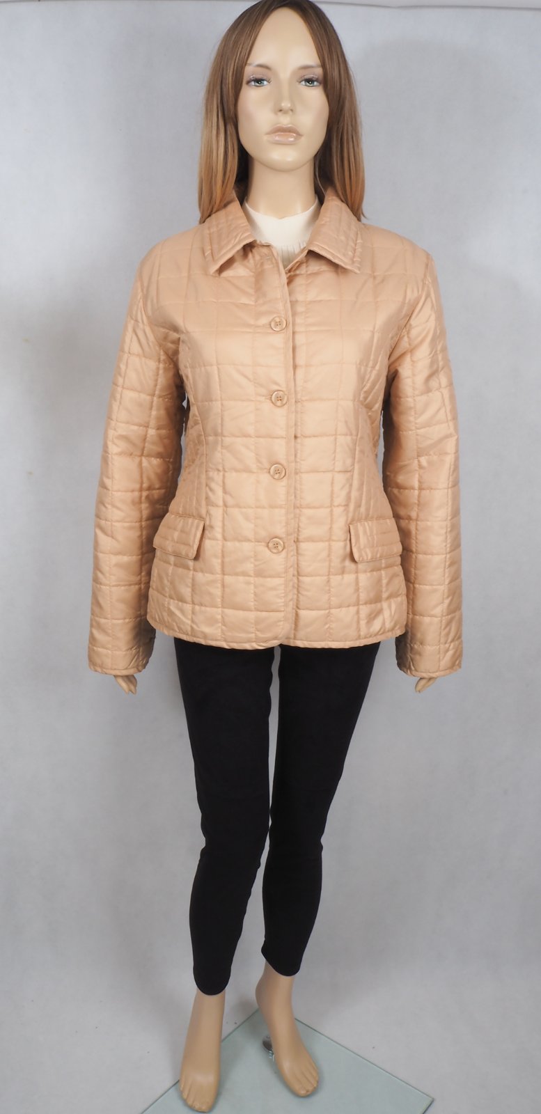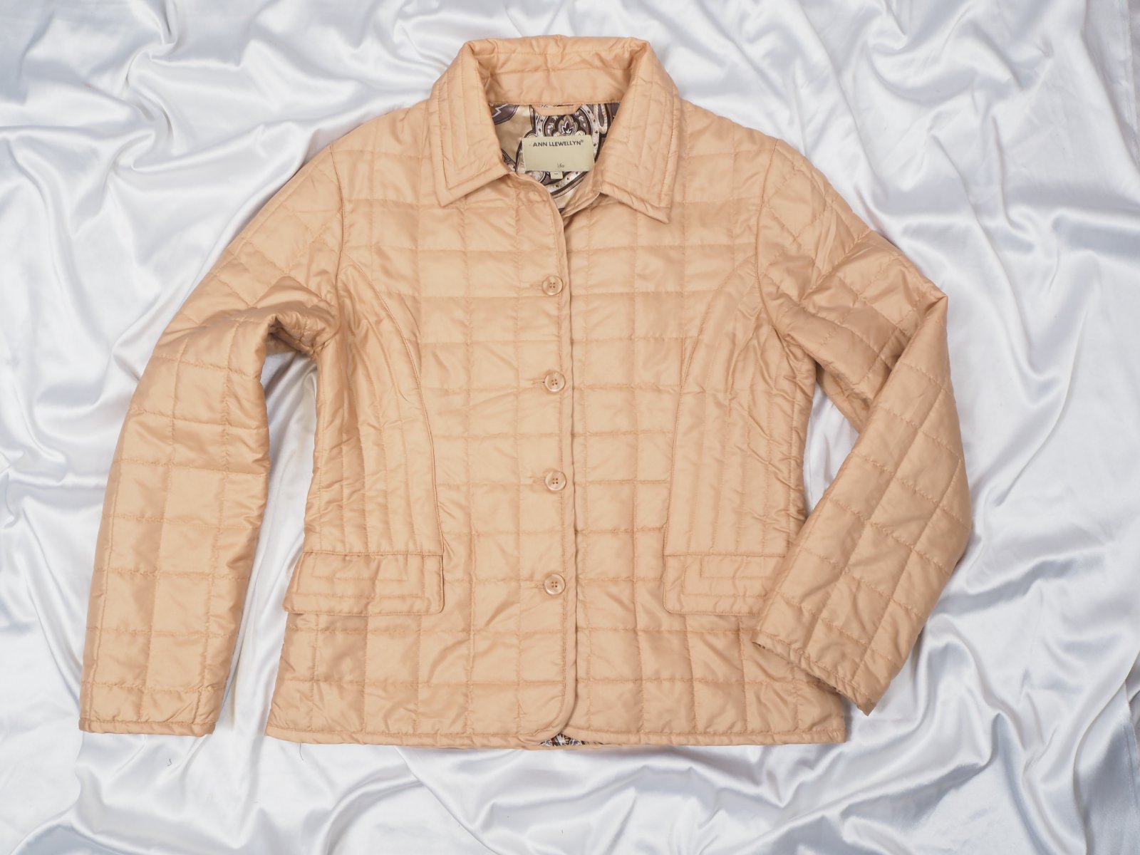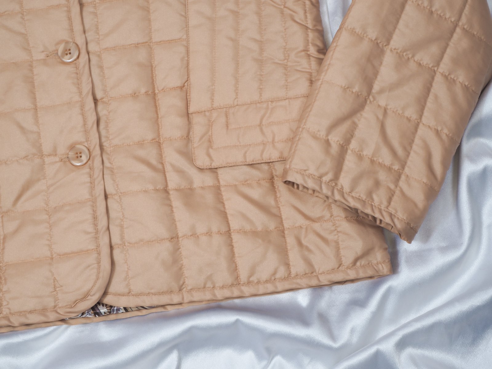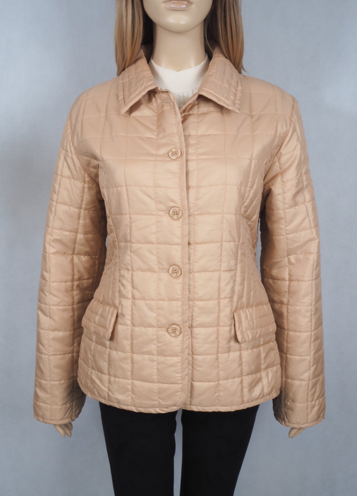 Kvalitná béžová prešívaná bunda, zapínanie na gombíky, nádherná vzorovaná podšívka, materiál 60% nylon, 40% polyester, super stav.