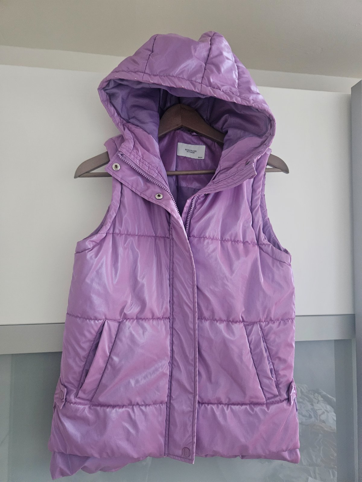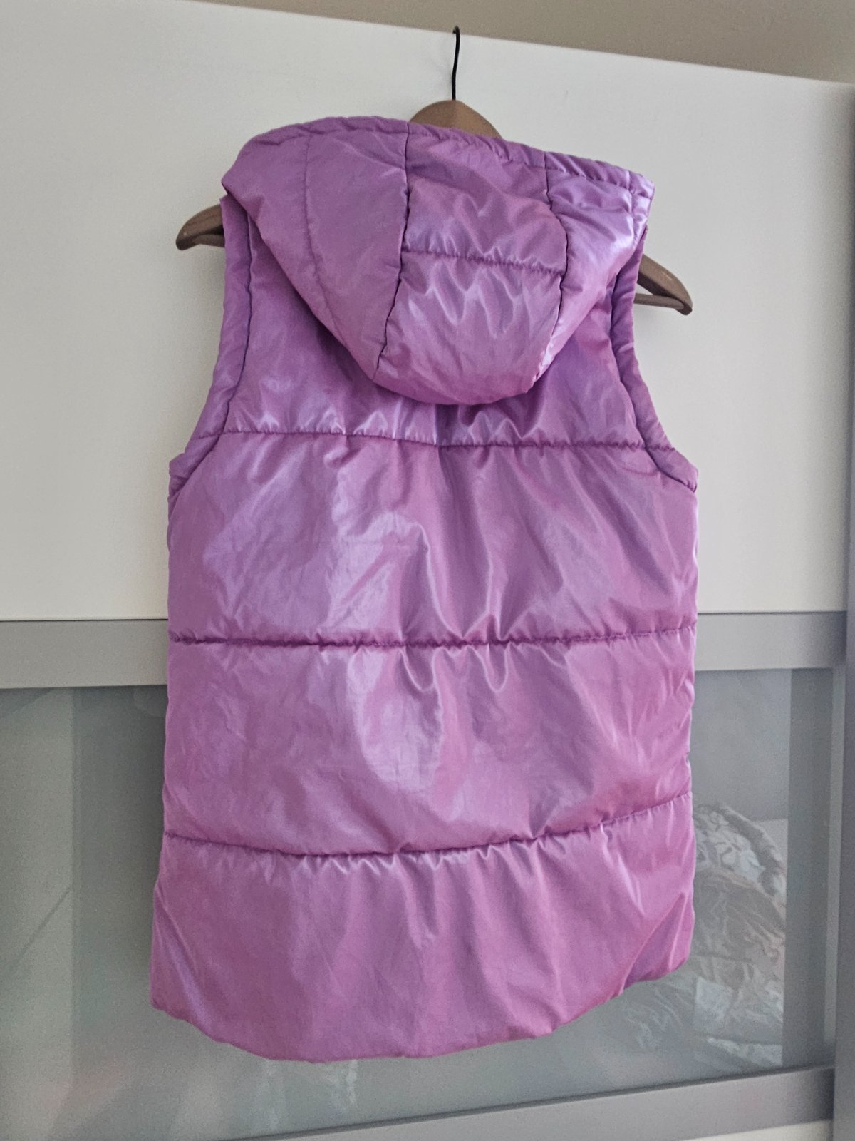 svetlo fialová hrubá lesklá vesta ako nová top stav bez chybičky zapínanie na zips vpredu dve vrecká, vo vnútri je skryté vrecko veľkosť 158 na 13 rokov dlžka 63 cm šírka 2x 56 cm