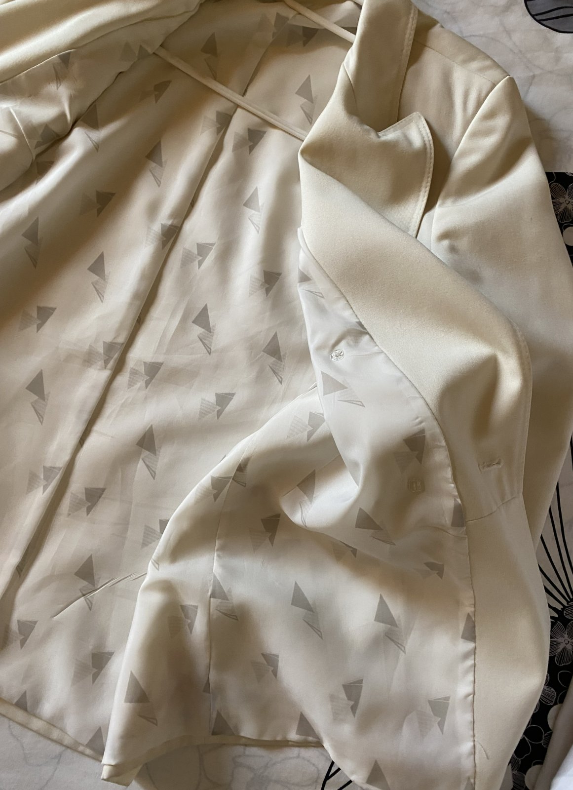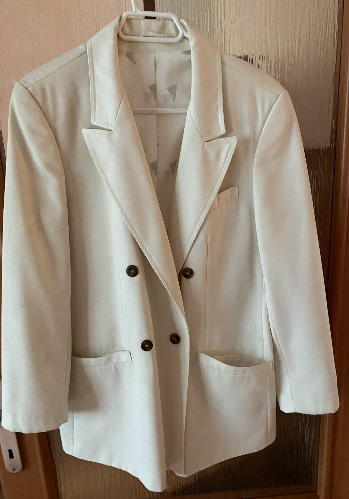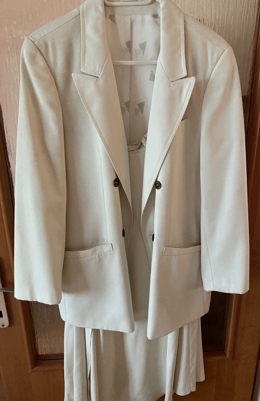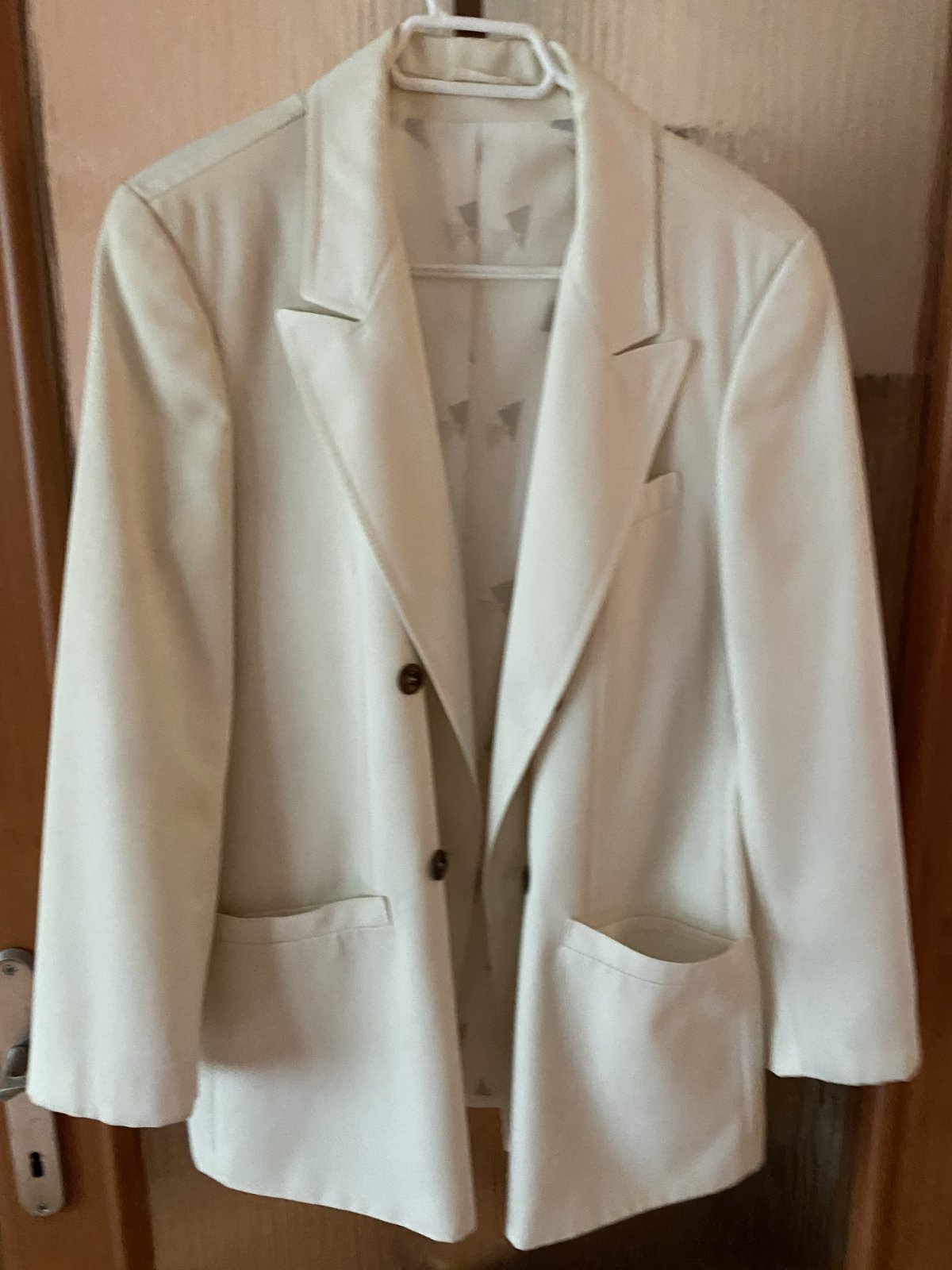 Elegantné podšité sako TREVIRA v. 40/42 - premerajte, kvalitne prepracované - viď detail foto, materiál 67% polyester, 33% polyamid - pevnejšia, nie tenká látka, nekrčivá, smotanová farba, hladká podšívka pre ľahké obliekanie, 3 funkčné vrecká, asi 2x oblečené. Miery merané v zapnutom stave: dĺžka od krku dolu: 76cm, šírka v podpazuší: 51cmx2, šírka dolu - spodná časť: 55cmx2, rukáv od ramena: 58cmx2 + 14cm plece ku golieru.