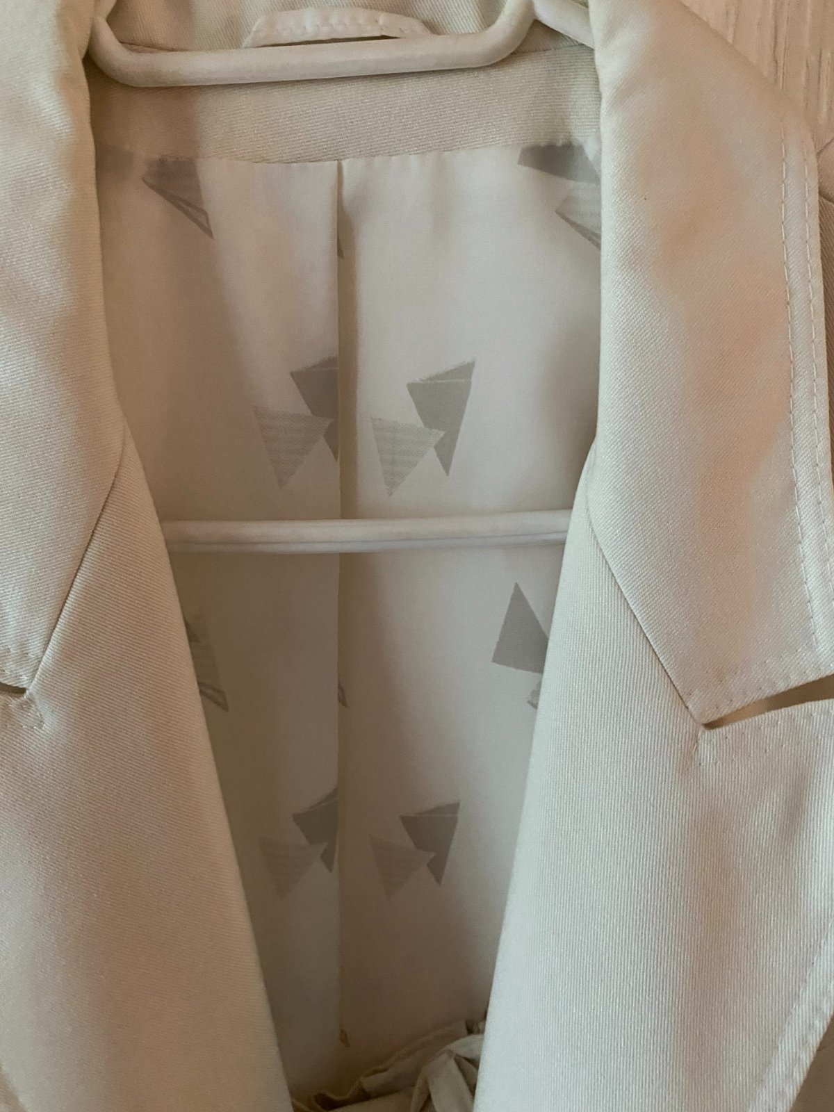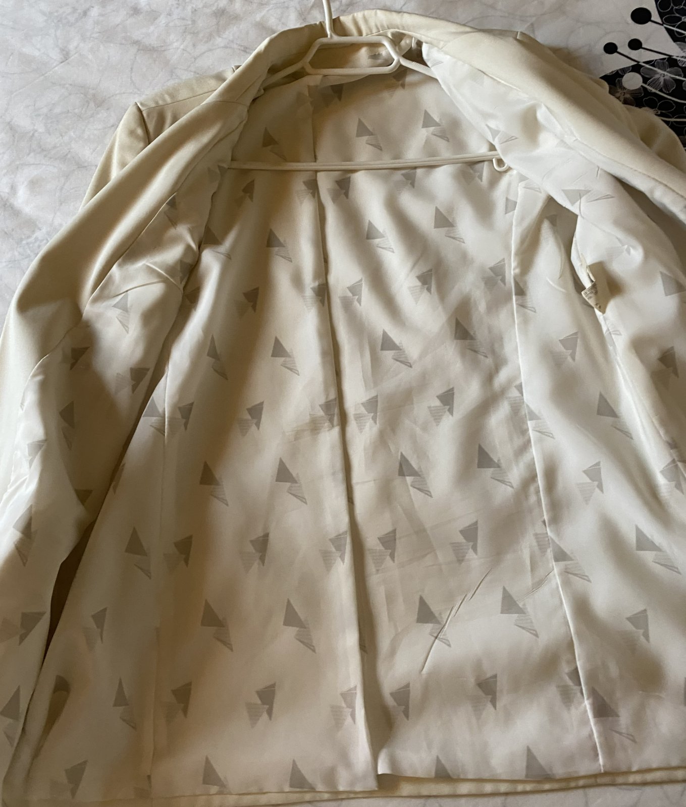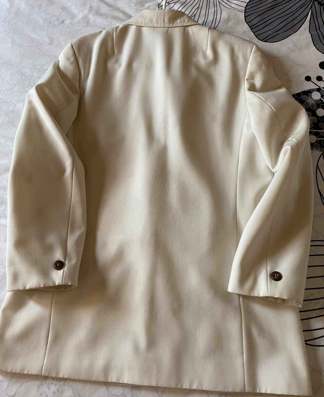 Elegantné podšité sako TREVIRA v. 40/42 - premerajte, kvalitne prepracované - viď detail foto, materiál 67% polyester, 33% polyamid - pevnejšia, nie tenká látka, nekrčivá, smotanová farba, hladká podšívka pre ľahké obliekanie, 3 funkčné vrecká, asi 2x oblečené. Miery merané v zapnutom stave: dĺžka od krku dolu: 76cm, šírka v podpazuší: 51cmx2, šírka dolu - spodná časť: 55cmx2, rukáv od ramena: 58cmx2 + 14cm plece ku golieru.