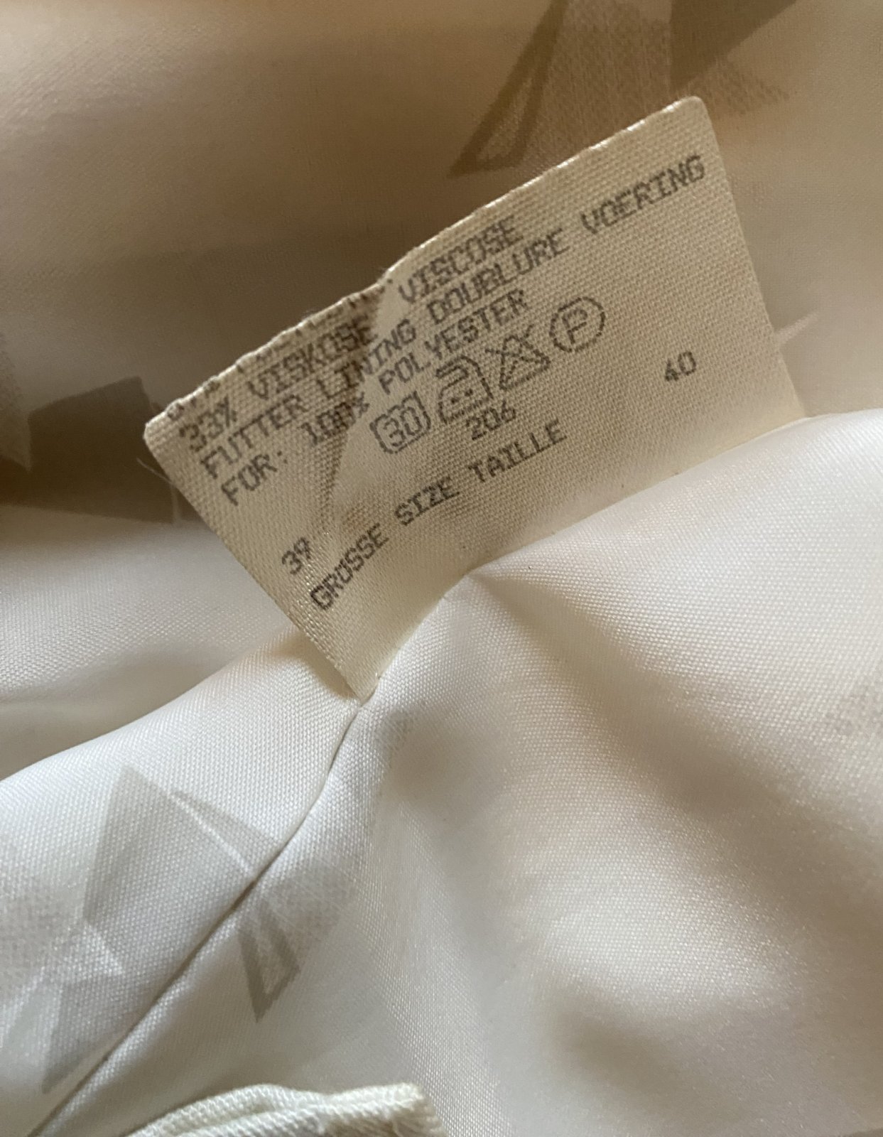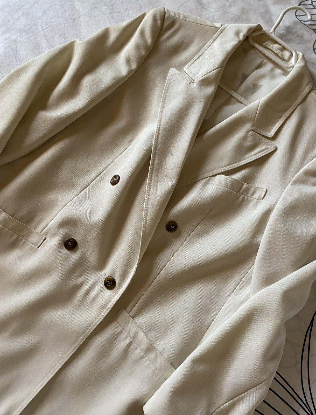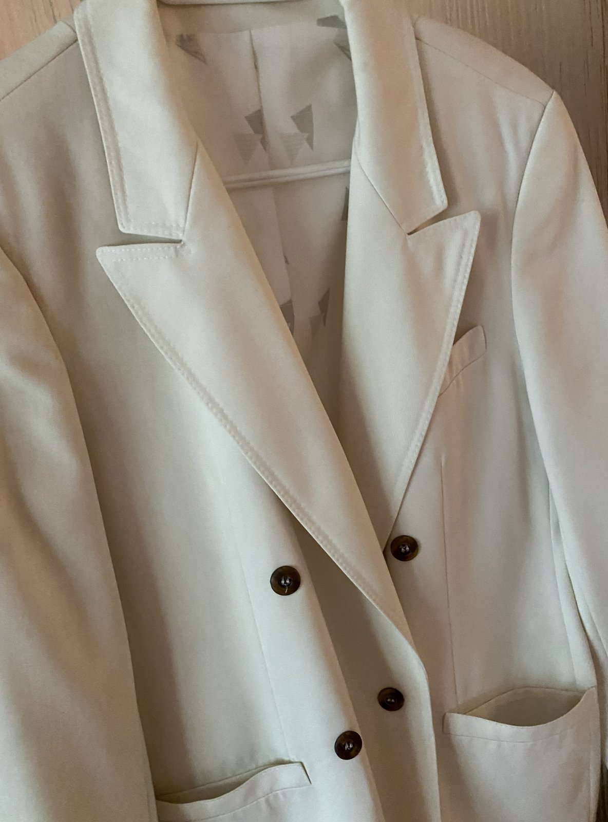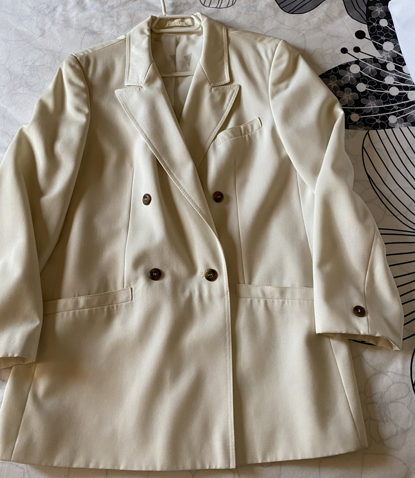Elegantné podšité sako TREVIRA v. 40/42 - premerajte, kvalitne prepracované - viď detail foto, materiál 67% polyester, 33% polyamid - pevnejšia, nie tenká látka, nekrčivá, smotanová farba, hladká podšívka pre ľahké obliekanie, 3 funkčné vrecká, asi 2x oblečené. Miery merané v zapnutom stave: dĺžka od krku dolu: 76cm, šírka v podpazuší: 51cmx2, šírka dolu - spodná časť: 55cmx2, rukáv od ramena: 58cmx2 + 14cm plece ku golieru.