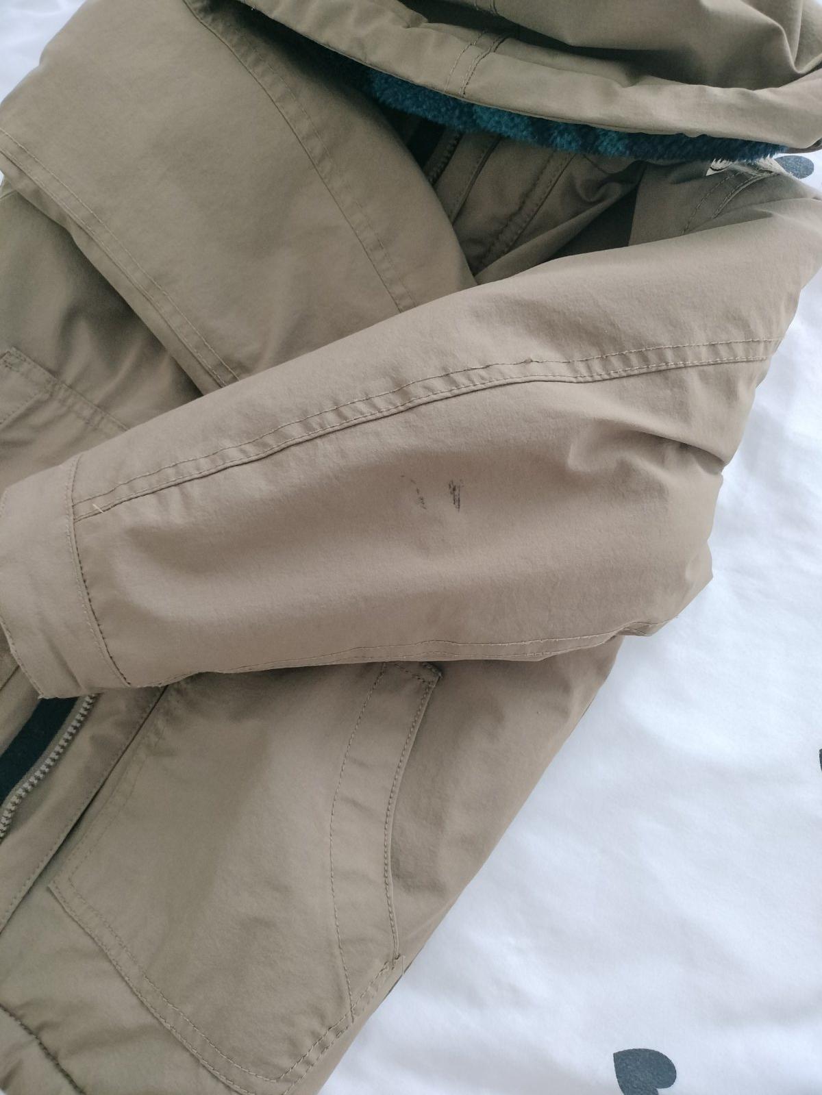 Krásna teplá bunda, pri fotení som si všimla akoby popísané na rukáve, viď foto, neskúšala som odstrániť, inak je perfektná