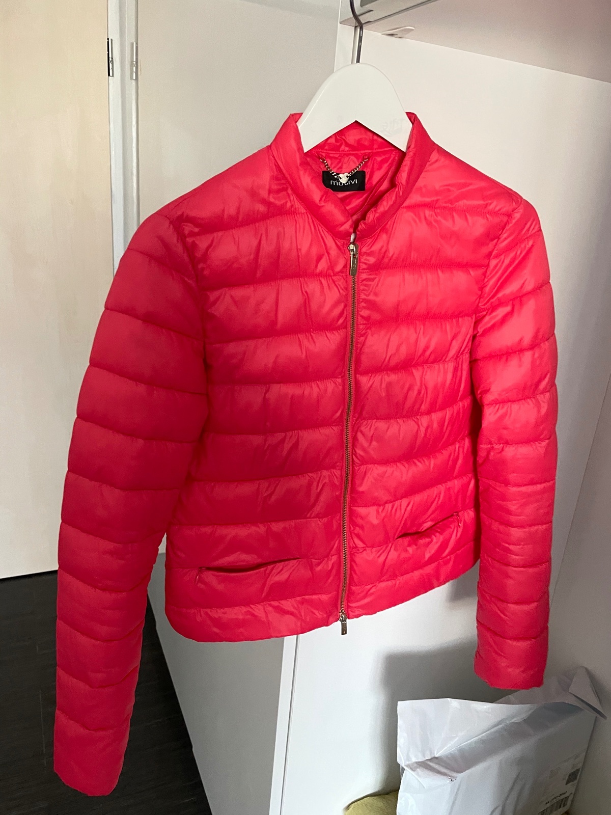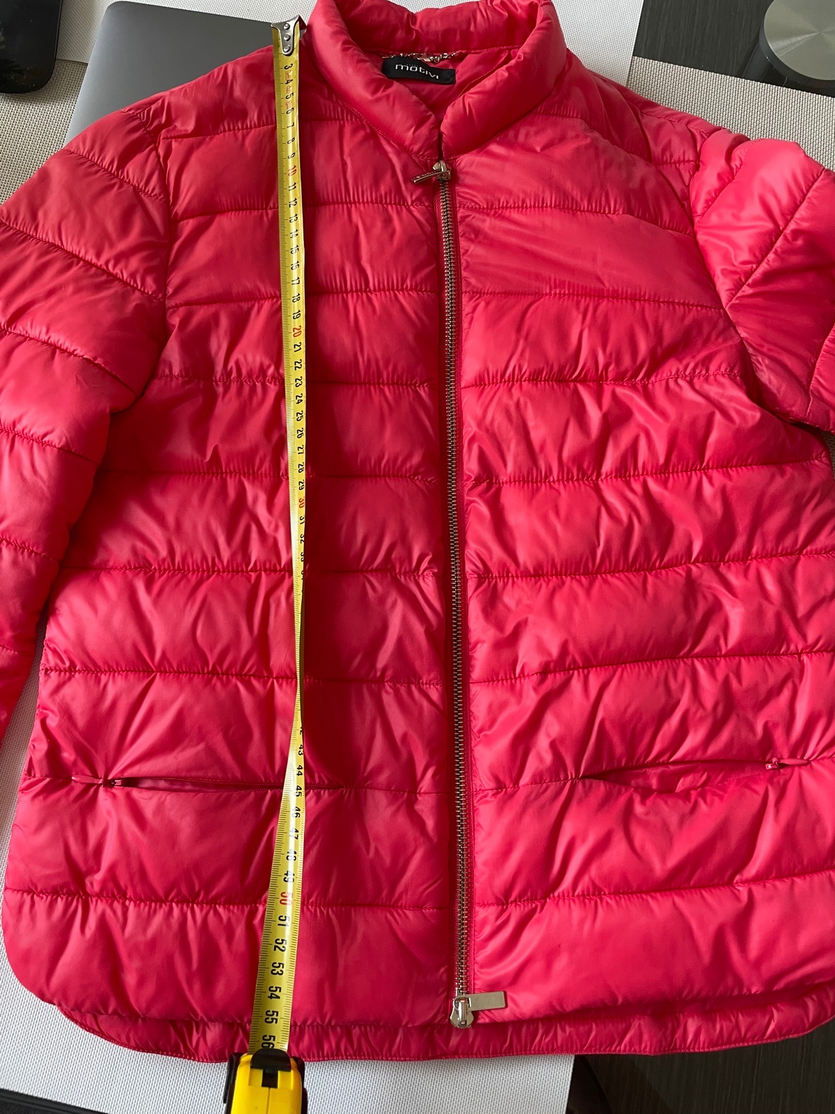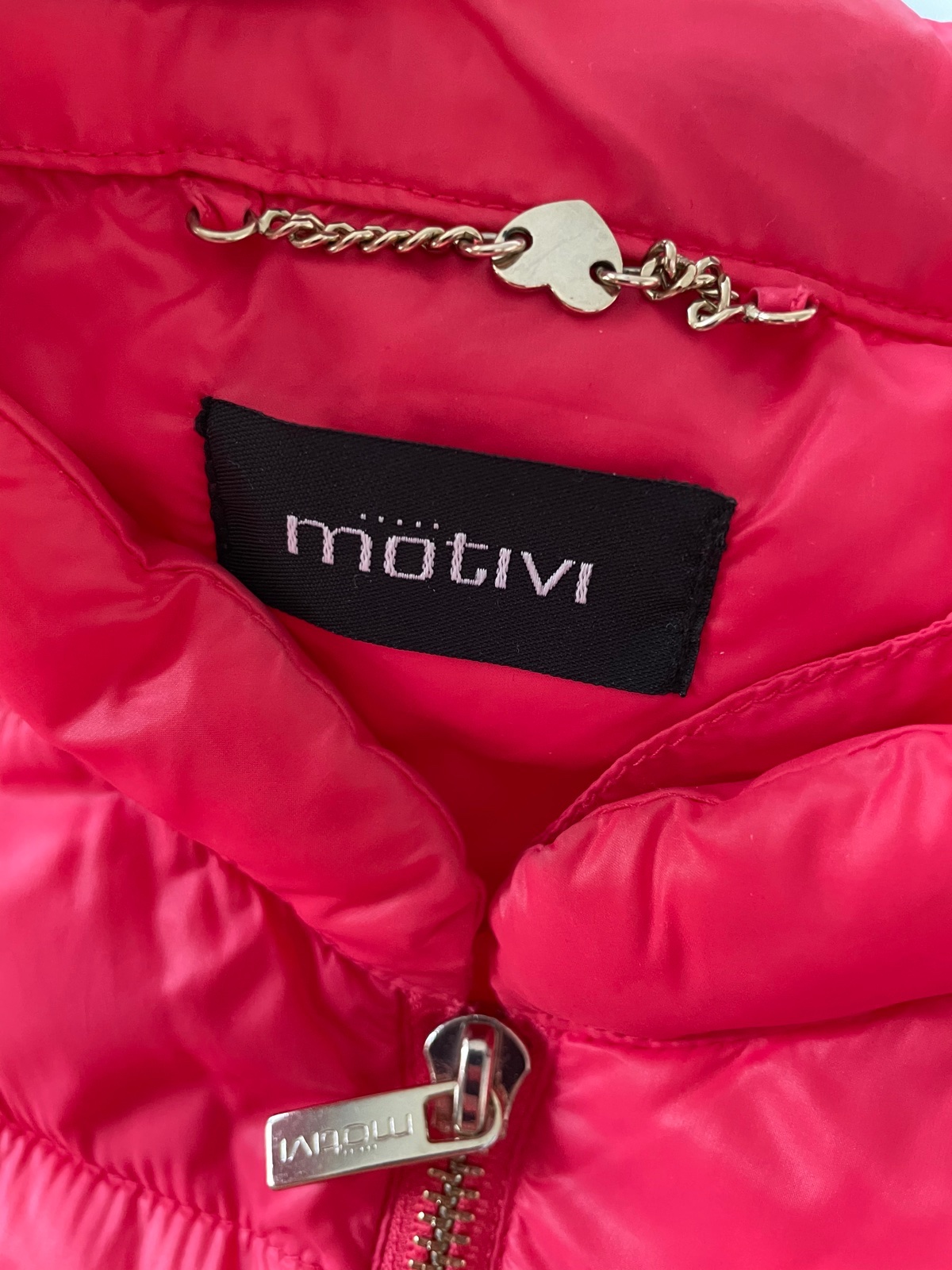 Krasna prechodna prestepovana bundicka Mötivi velkost 38 na predaj. zlaty zips, vrecka so zipsom. bez poskodenia, len prilezitostne nosene. farba nieco medzi ruzovou a lososovou:-)