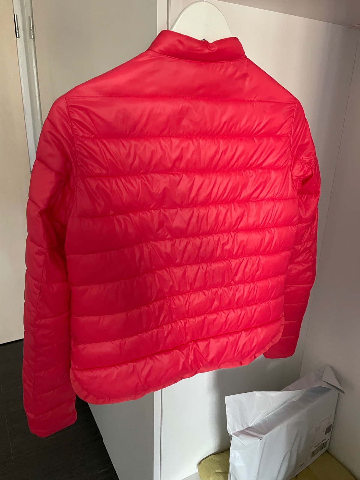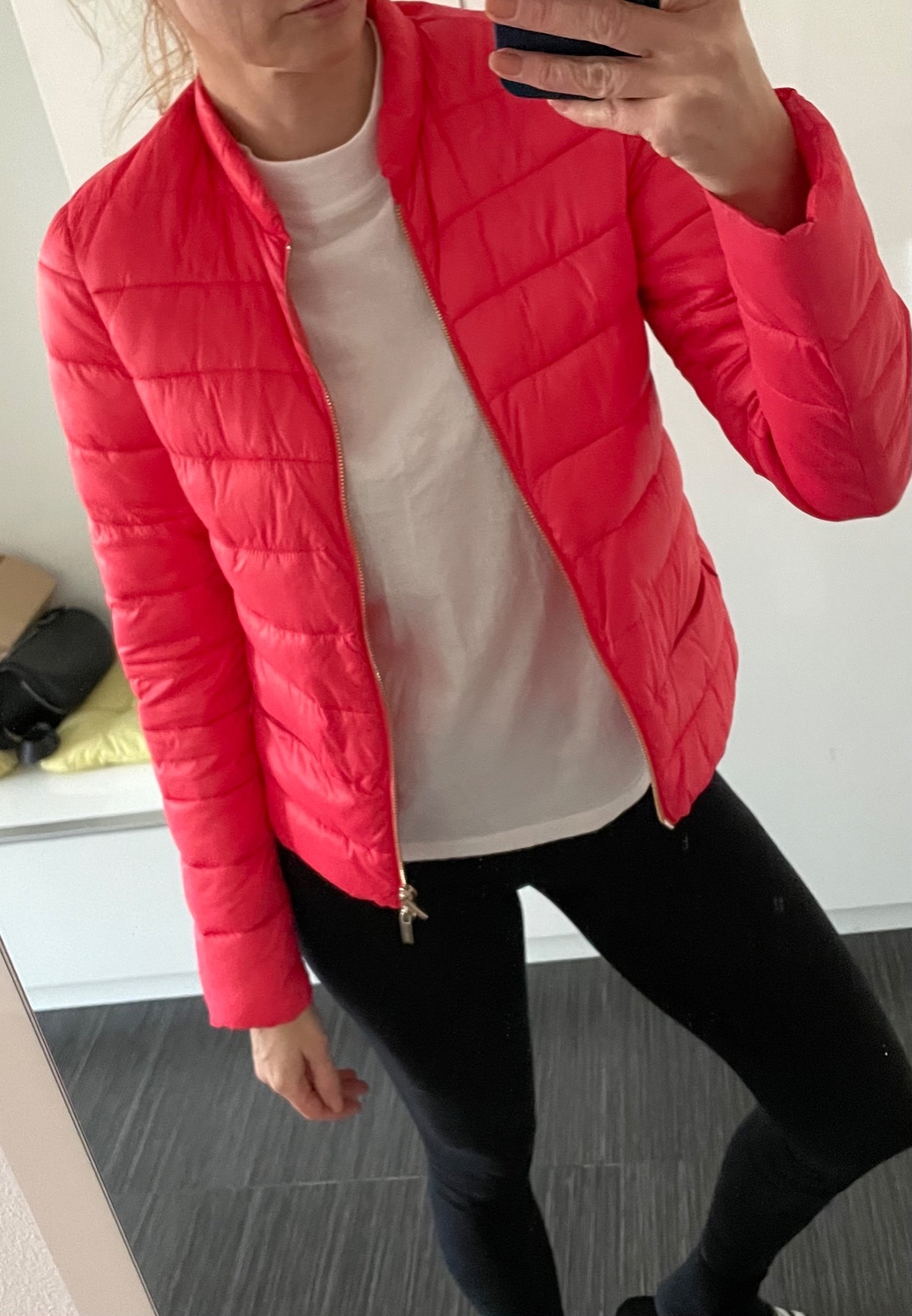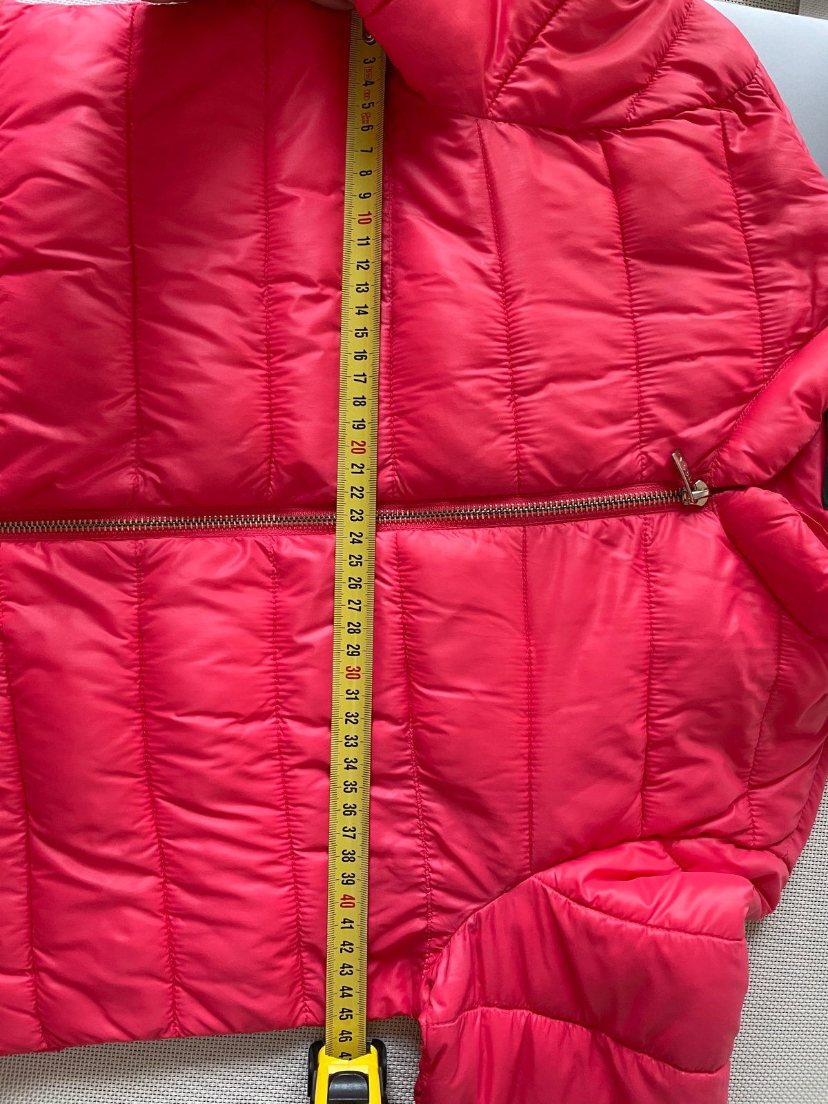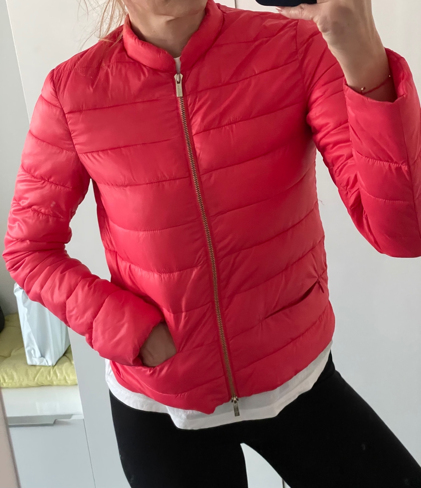 Krasna prechodna prestepovana bundicka Mötivi velkost 38 na predaj. zlaty zips, vrecka so zipsom. bez poskodenia, len prilezitostne nosene. farba nieco medzi ruzovou a lososovou:-)