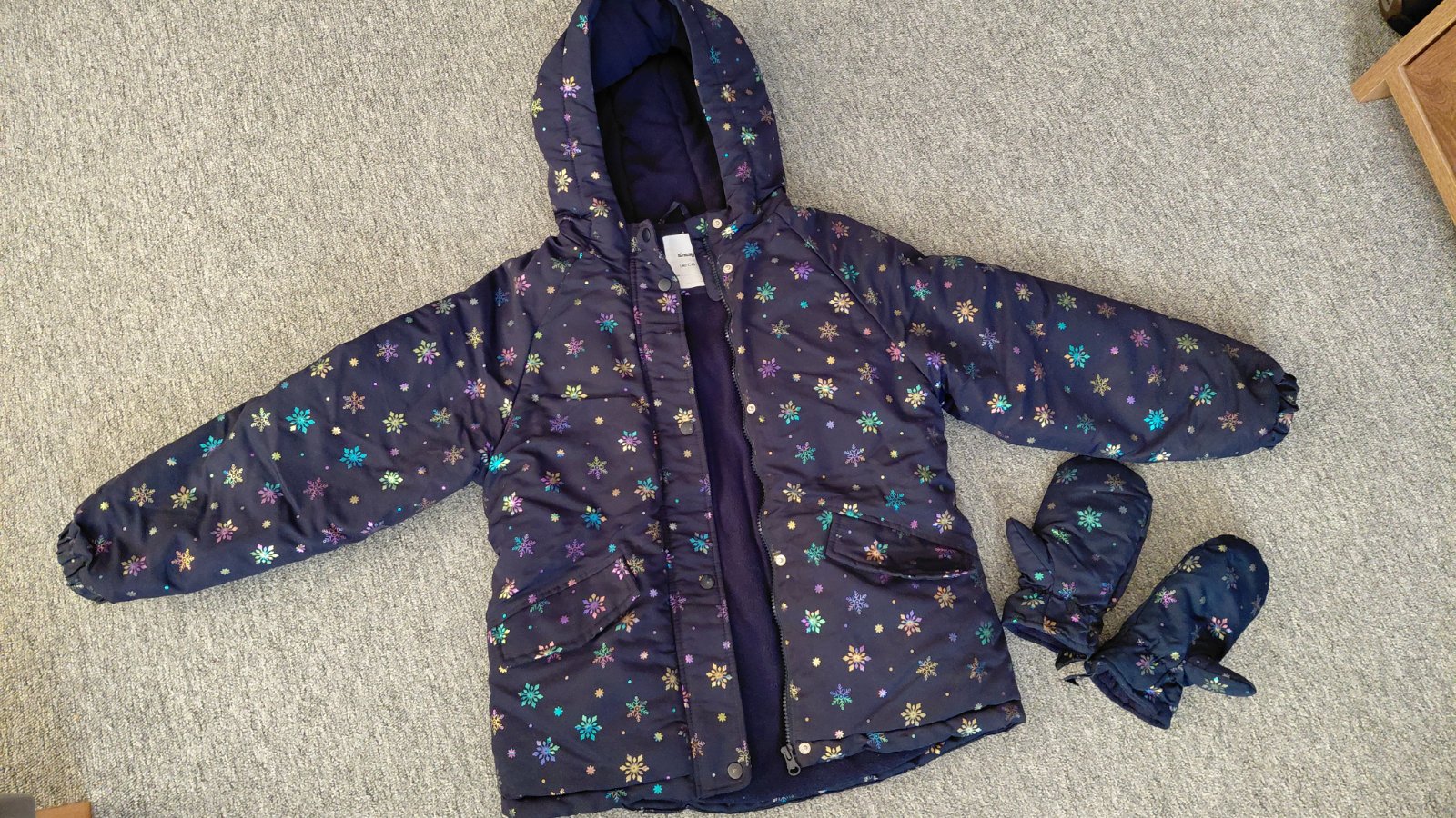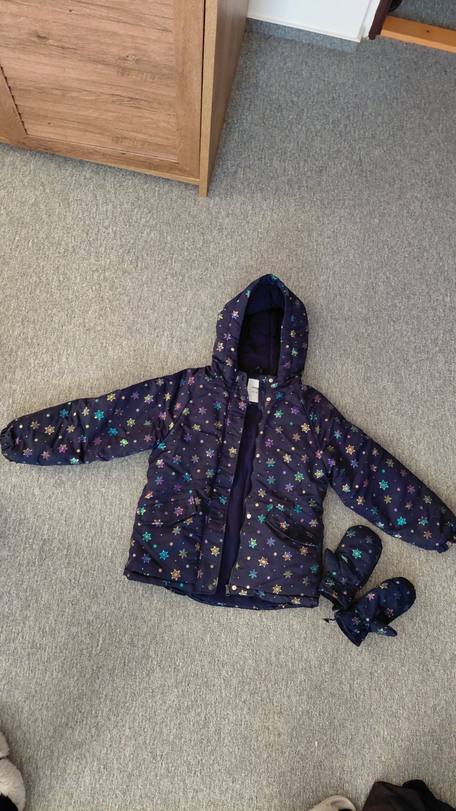 Predam novu zateplenu bundu s rukavicami, tmavomodra s vlockami, v.140. Vhodna na jesen aj zimu. 15e