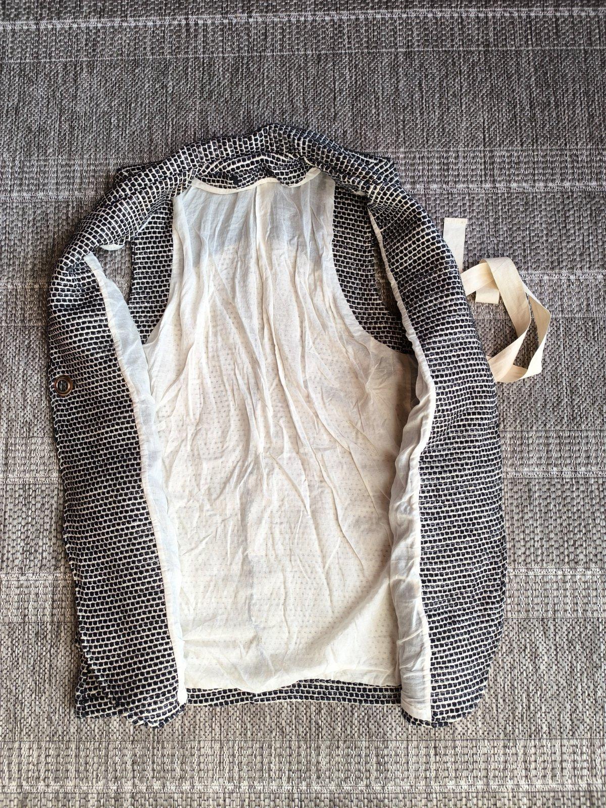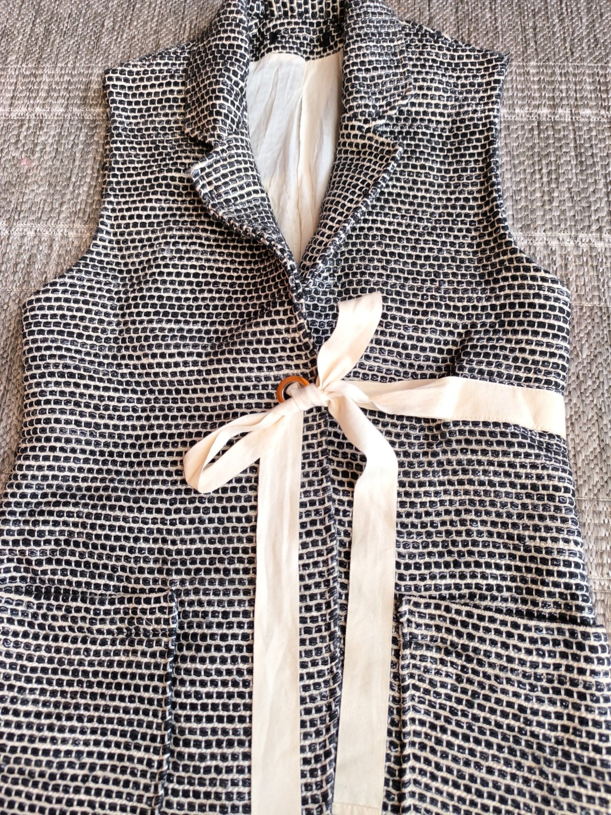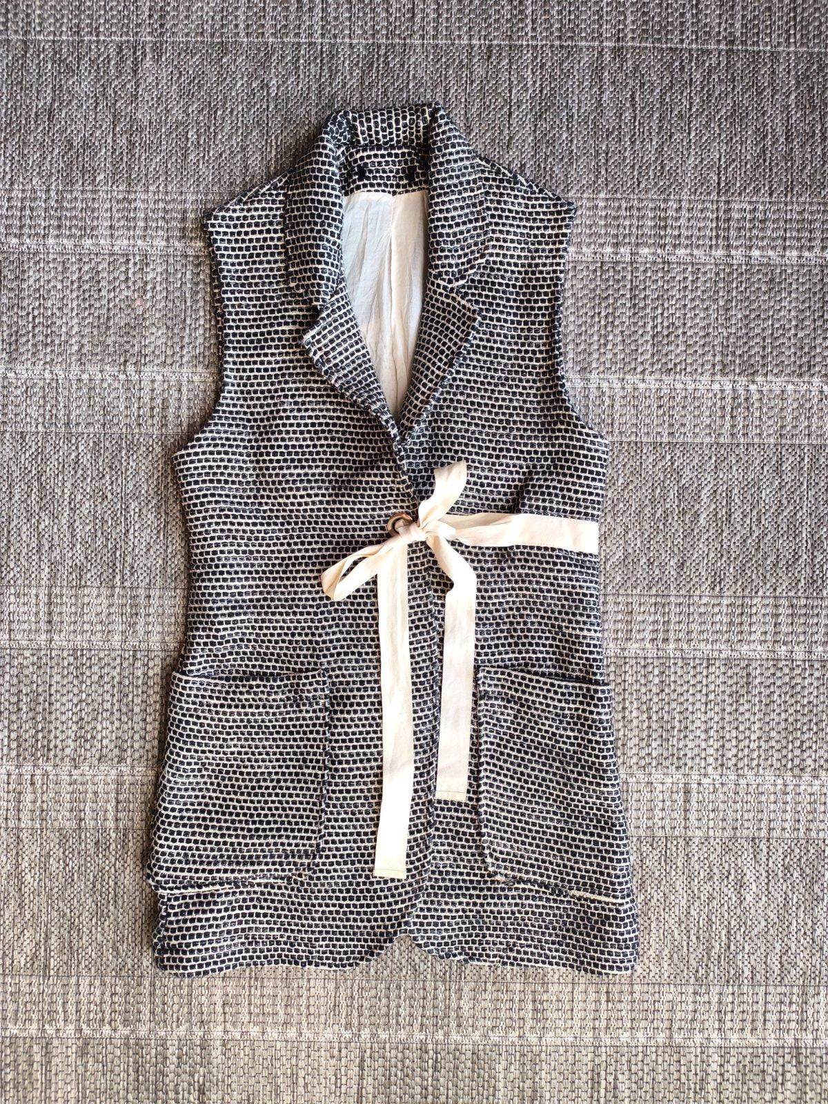 Podšitá predĺžená vesta z hrubšieho materiálu (kabátovina). S efektnou stuhou na zaväzovanie vpredu, prispôsobí sa podľa potreby. V super stave. Veľkosť S, dĺžka 80cm, šírka cez chrbát 40cm, vpredu zaviažete ako budete potrebovať.