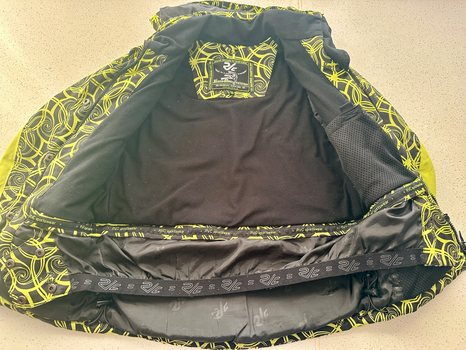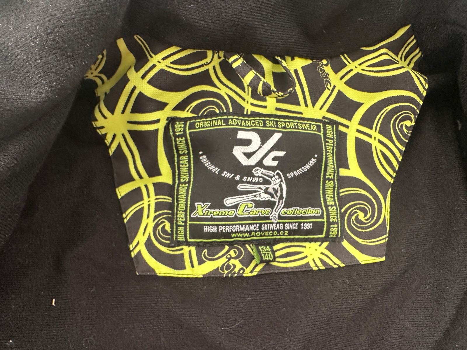 Žltozelená ski funkná športová bunda RVC veľkosť 134-140, snežný pás, vetracie otvory, kapucňa. Na manžetá h chýbajú uťahovacie pásiky na lepák, ale je tam gumka. Dĺžka 155, vzadu predĺžená 160.