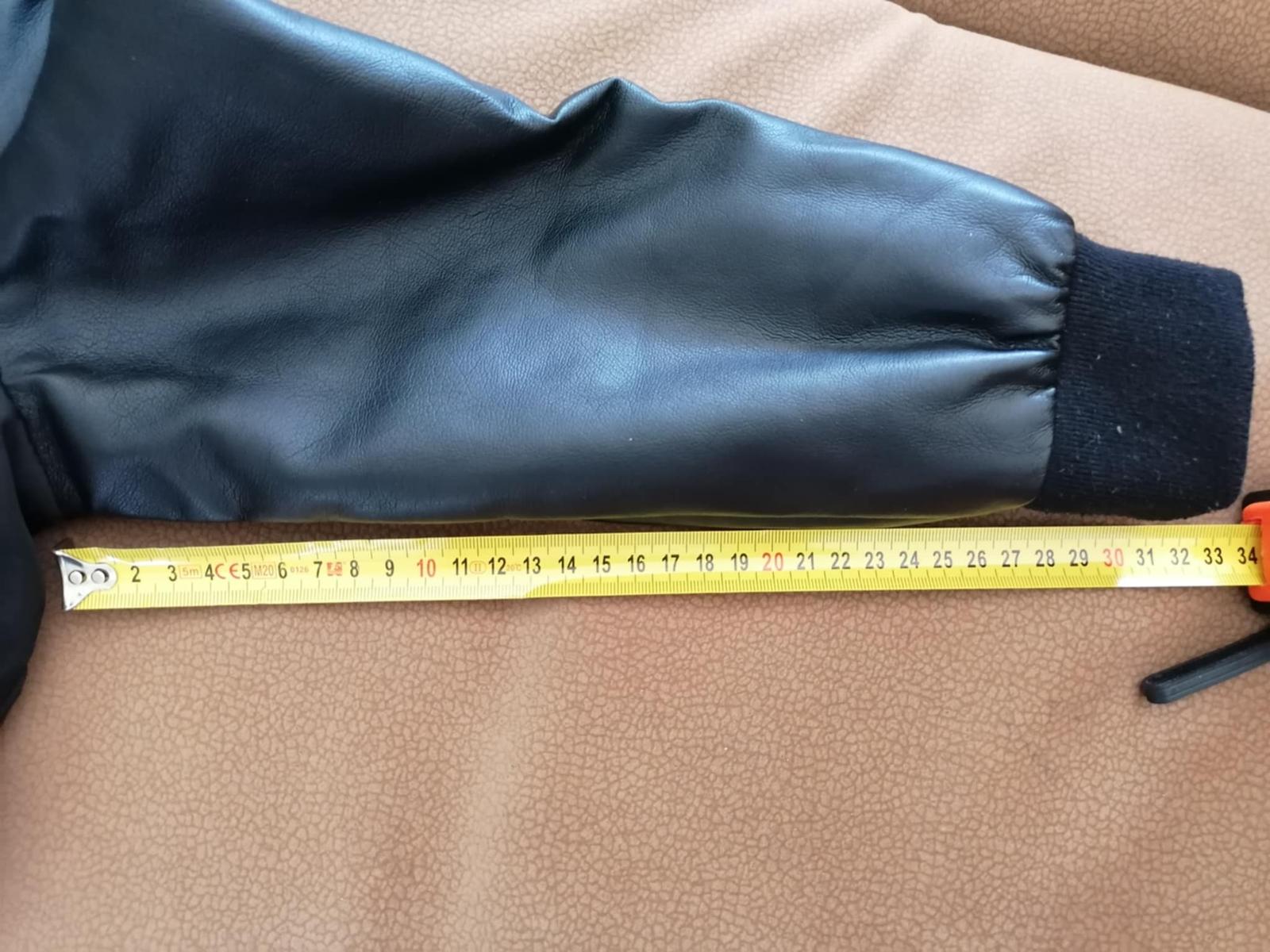 Krásna čierna bomber bunda. Koženkové rukávy. Pri pravom vačku jemne šuchnutá (vidno na foto). Pri nosení nevidno. Perfektne sedí. Krajšia ako na foto.