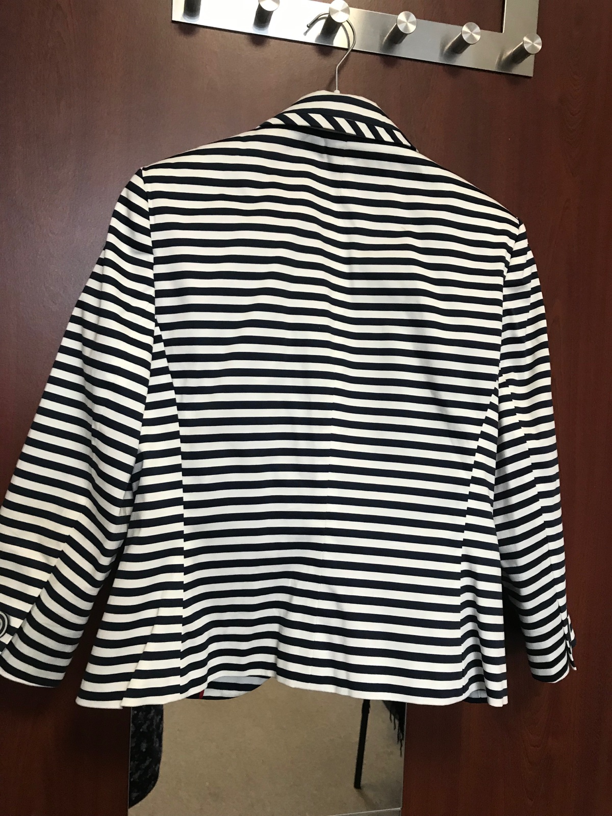 Predám pekné dámske sako veľkosť M. Made in Italy. Sako je elastické dobre sa prispôsobí postave. Sako má 3/4 rukávy. Dĺžka saká 54cm, dĺžka rukáva od ramena 35cm, šírka v ramenách 38, šírka v pá...
