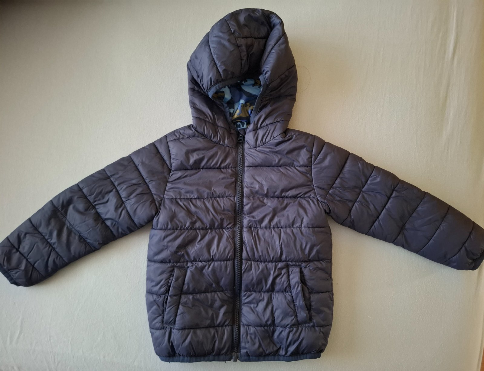Prechodná vetrovka bez poškodení, tmavomodrá, krajšia, ako na obrázku. Nosená málo, na striedačku s inými. Cena je uvedená bez poštovného.