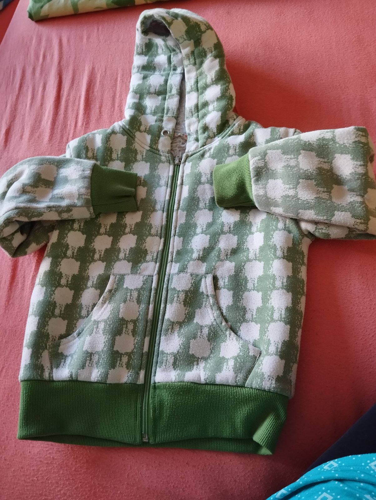 Látková bunda s kožušinou, kapucňa sa dala stiahnuť, no odpadol na jednej strane cvoček, tak sme šnúrku dali preč, plne funkčná, dĺžka 46 CM, šírka 40 CM, rukáv 43 cm