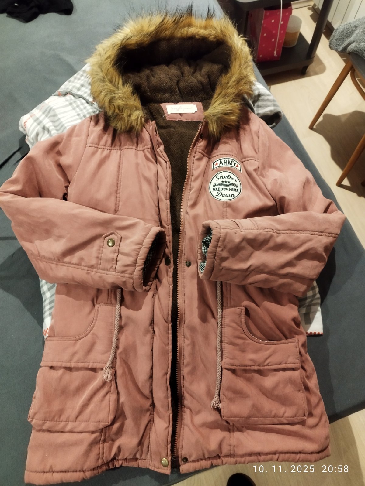- je vo veľmi dobrom stave, kapucňa je na pevno, kožušinka sa dá zložiť, farba taká výraznejšia lososová až do oranžova dĺžka 77 cm, obvod prsia 48 cm, rukáv 59 cm, plece 10,5 cm