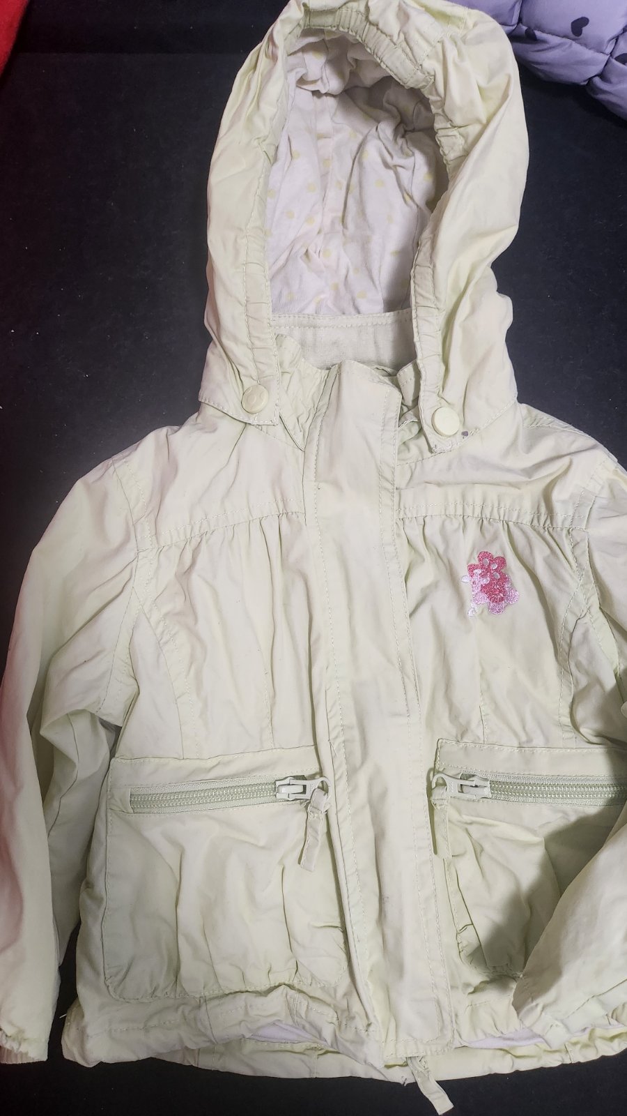 Nádherná bundička, nosena asi 3 krát. Tenká na prechod alebo aj na chladnejšie leto. Na vreckách motív mačky. Farba je v skutočnosti krajšia.