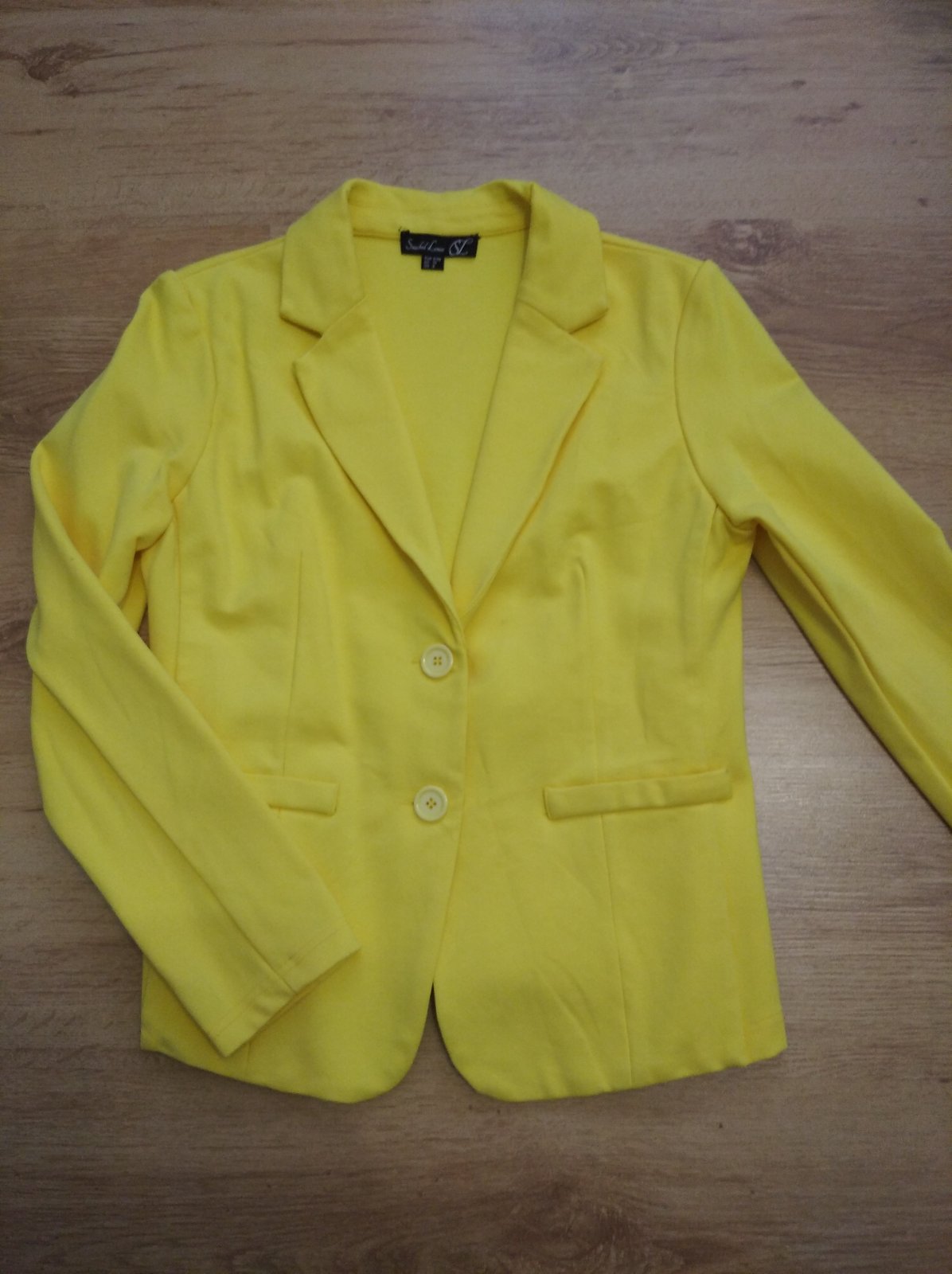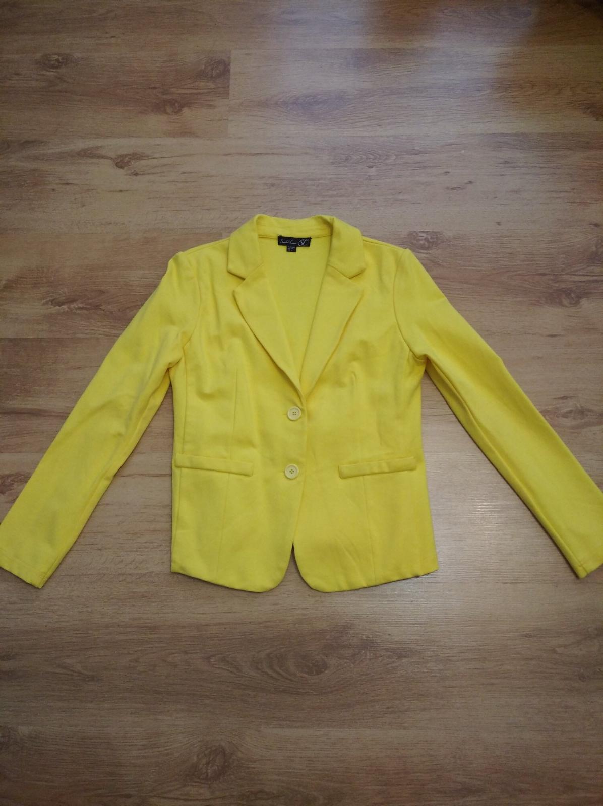Žlté sako z kvalitnej "teplákoviny". Oblečené iba 1x, je ako nové. Veľkosť S, rozmery: šírka cez prsia 2x43-48cm, pás 2x41-46 cm, dĺžka vpredu 61cm, dĺžka vzadu 52cm, rukáv 58cm.