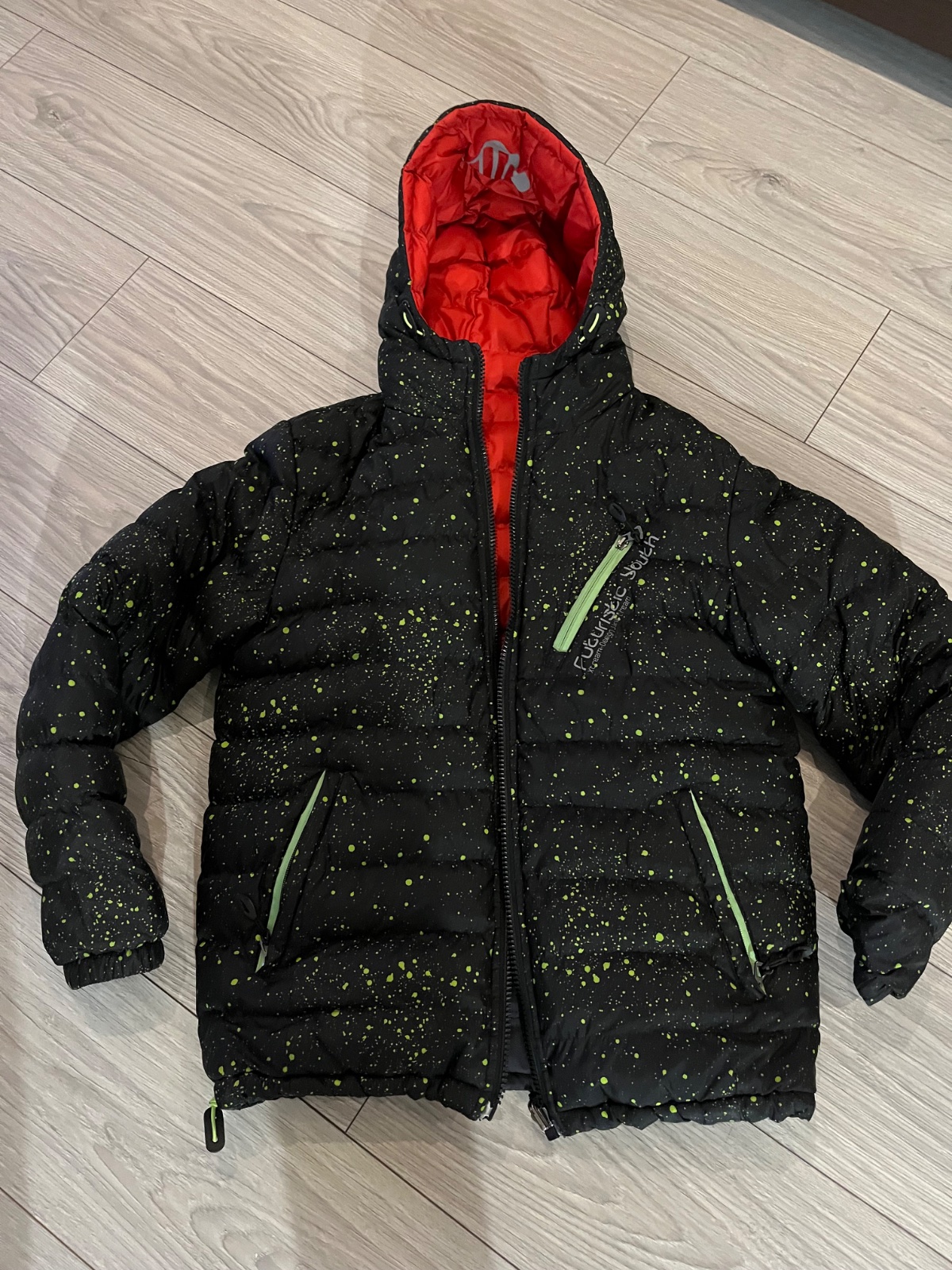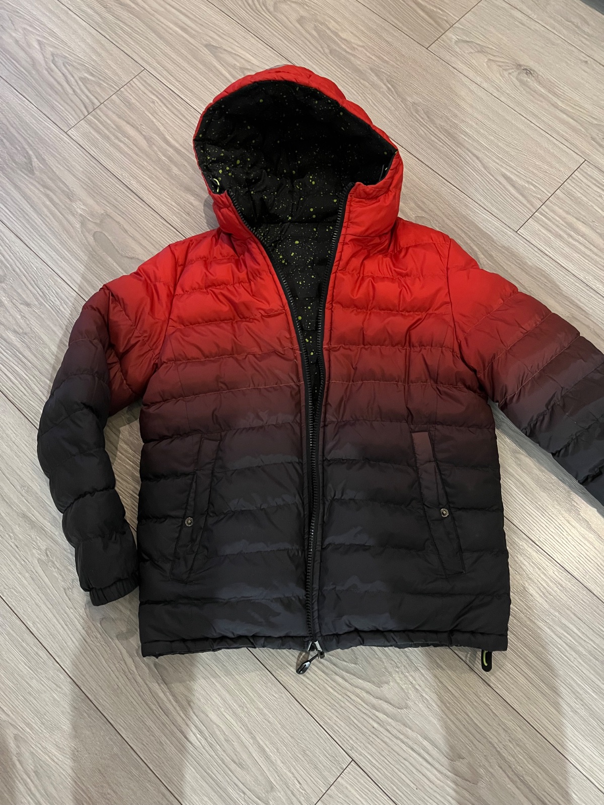 zimná červená teplá bunda s fleesovou podšívkou,antireflexný pásik, nosená velmi málo, bez akýchkolvek poškodení, v 100% stave....celk. dl.79cm, šírka pod paz. 2x62m, rukáv od krku 76cm.....pošt....