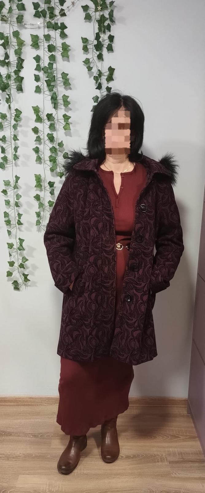 Ponúkam na predaj výnimočný dámsky kabát, ktorý kombinuje špičkový materiál s originálnym dizajnom. Kabát má hlbokú vínovú farbu s čiernym vzorom, ktorý pôsobí veľmi elegantne a hneď upúta pozornosť.