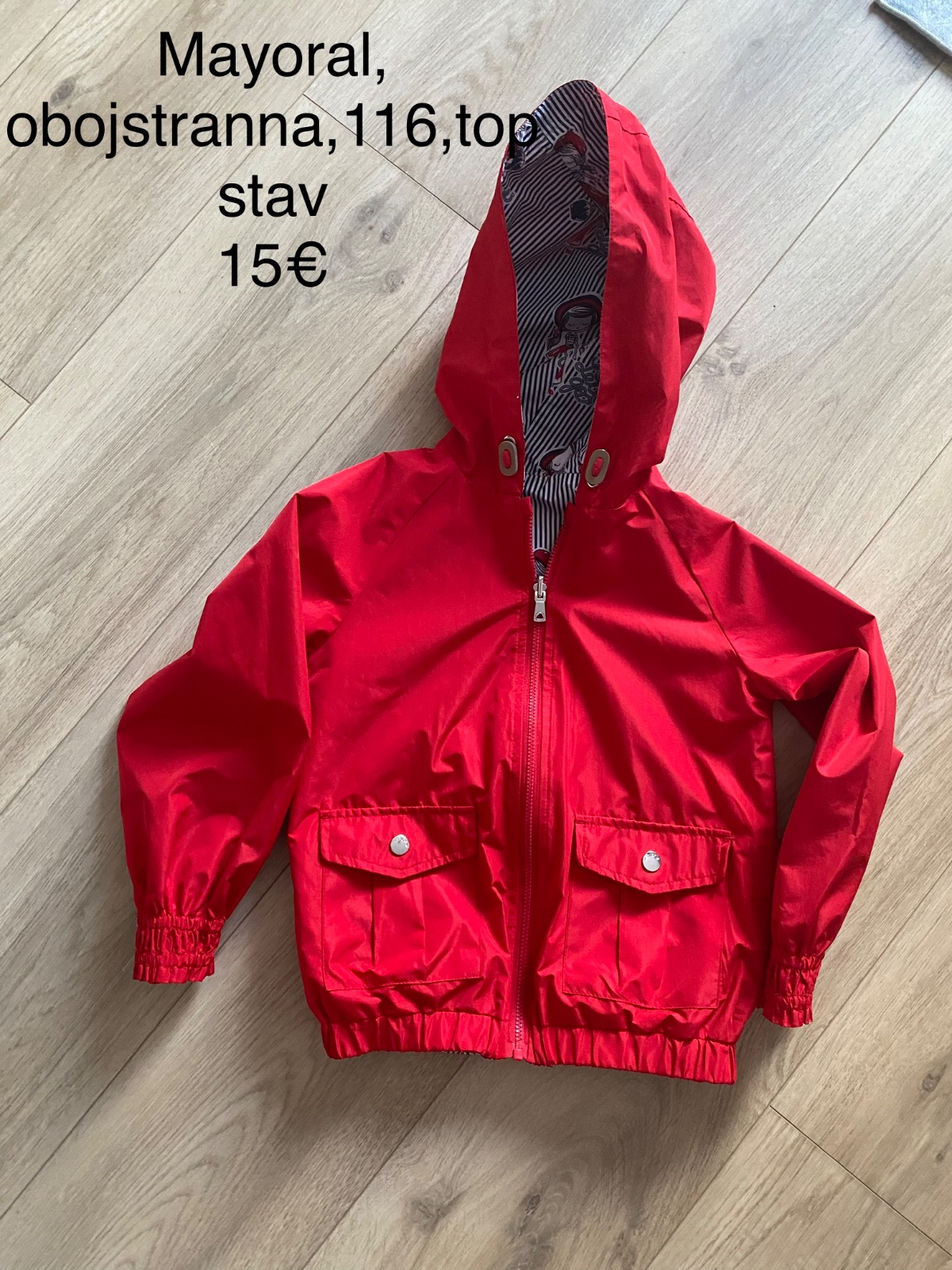 Krásna obojstranna bunda značky Mayoral, z jednej strany červená, z druhej potlač dievčat