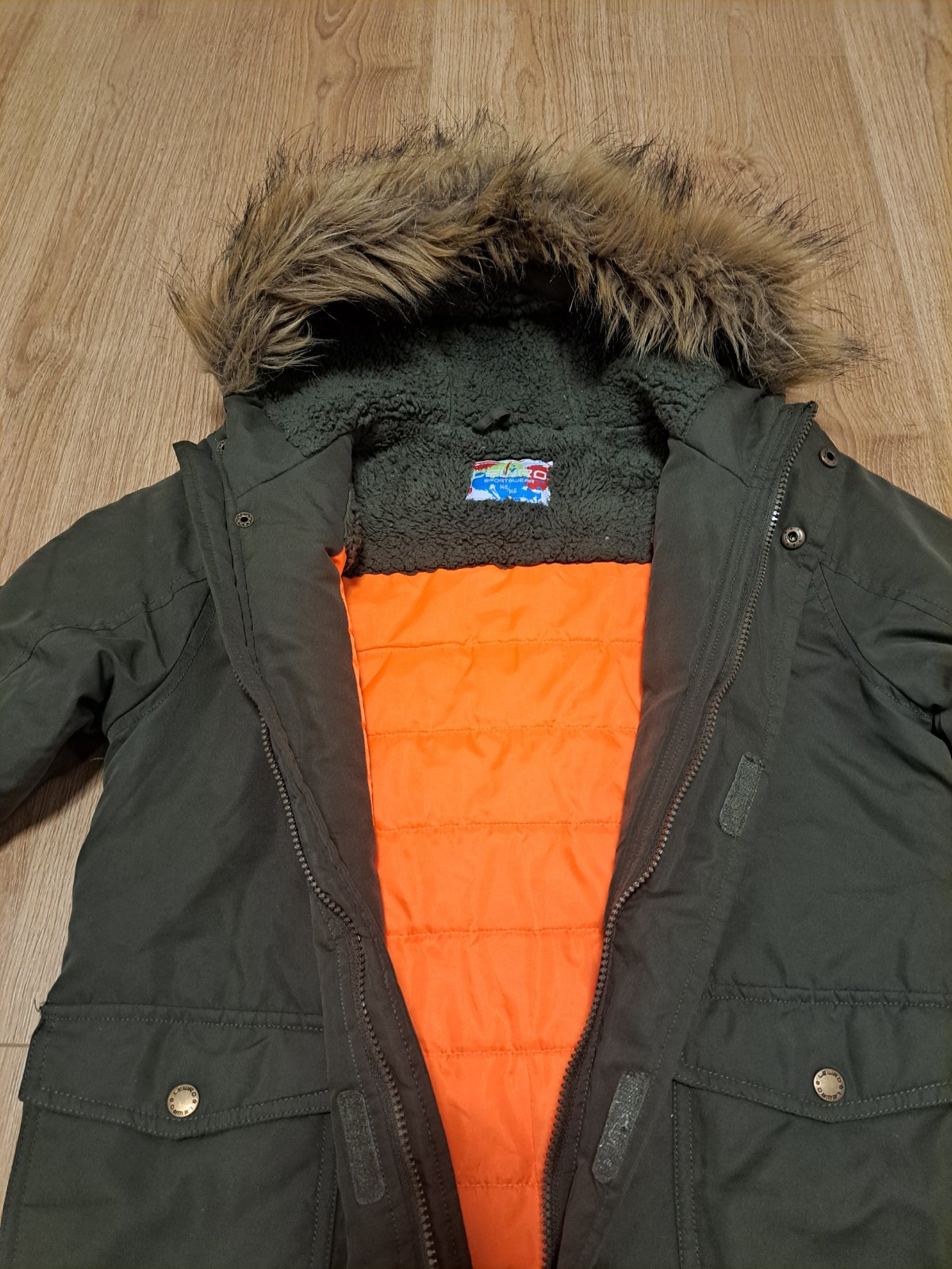 Bunda v dobrom nosenom stave, tepla, kapuca sa da odobrat, na lavom vrecku odpadol bezec na zipse. Cel.dlzka-59cm, rukav od krku-60cm, sirka popod pazuchy-46cm x 2