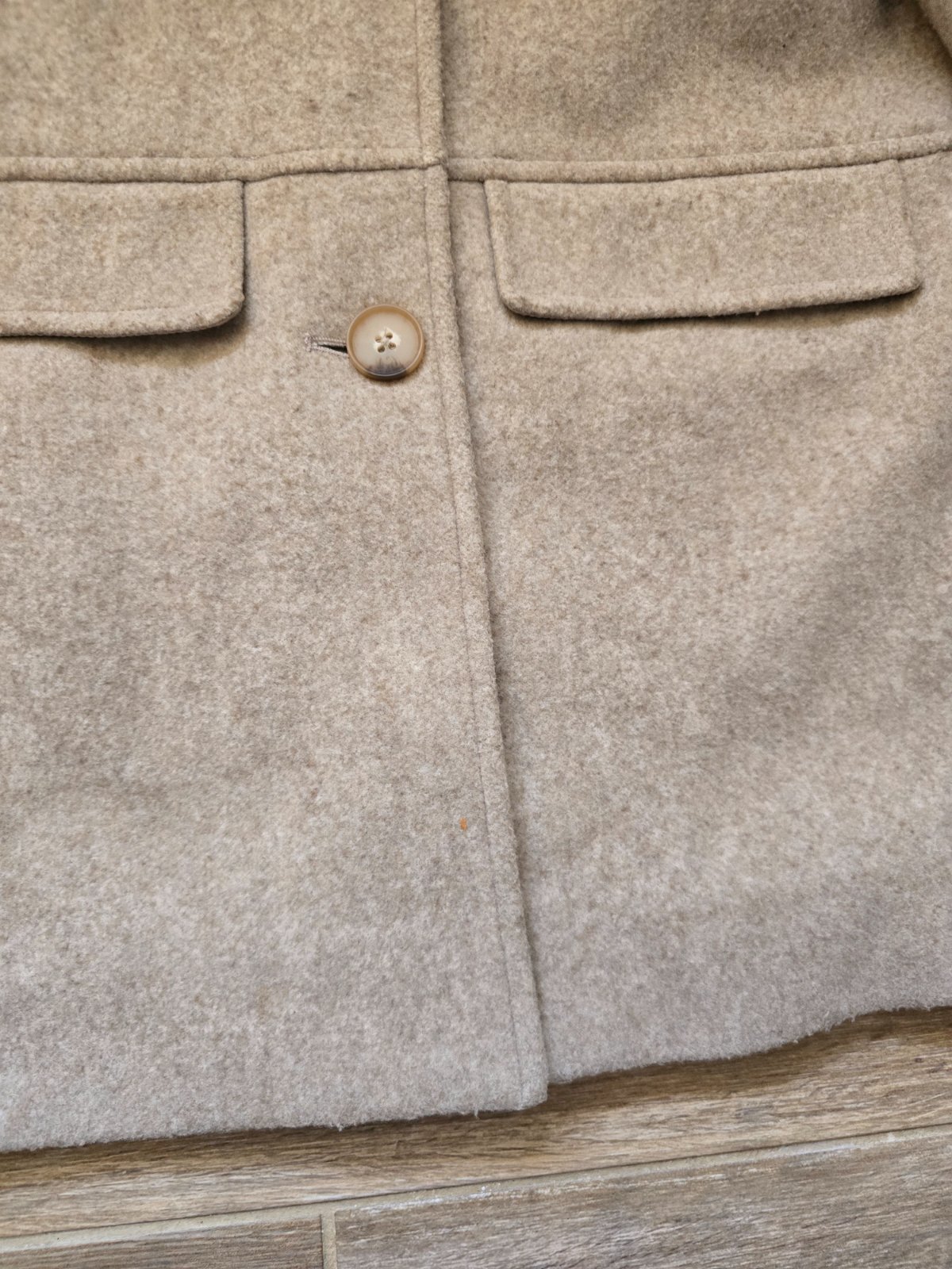 Mäkkučké sako, podšité saténom. Bez poškodení. Chýba mu jeden gombík. Dĺžka 51 cm, šírka 41 cm, rukáv od krku 60 cm, horná časť rukáva 50 cm, spodná časť rukáva 36 cm.