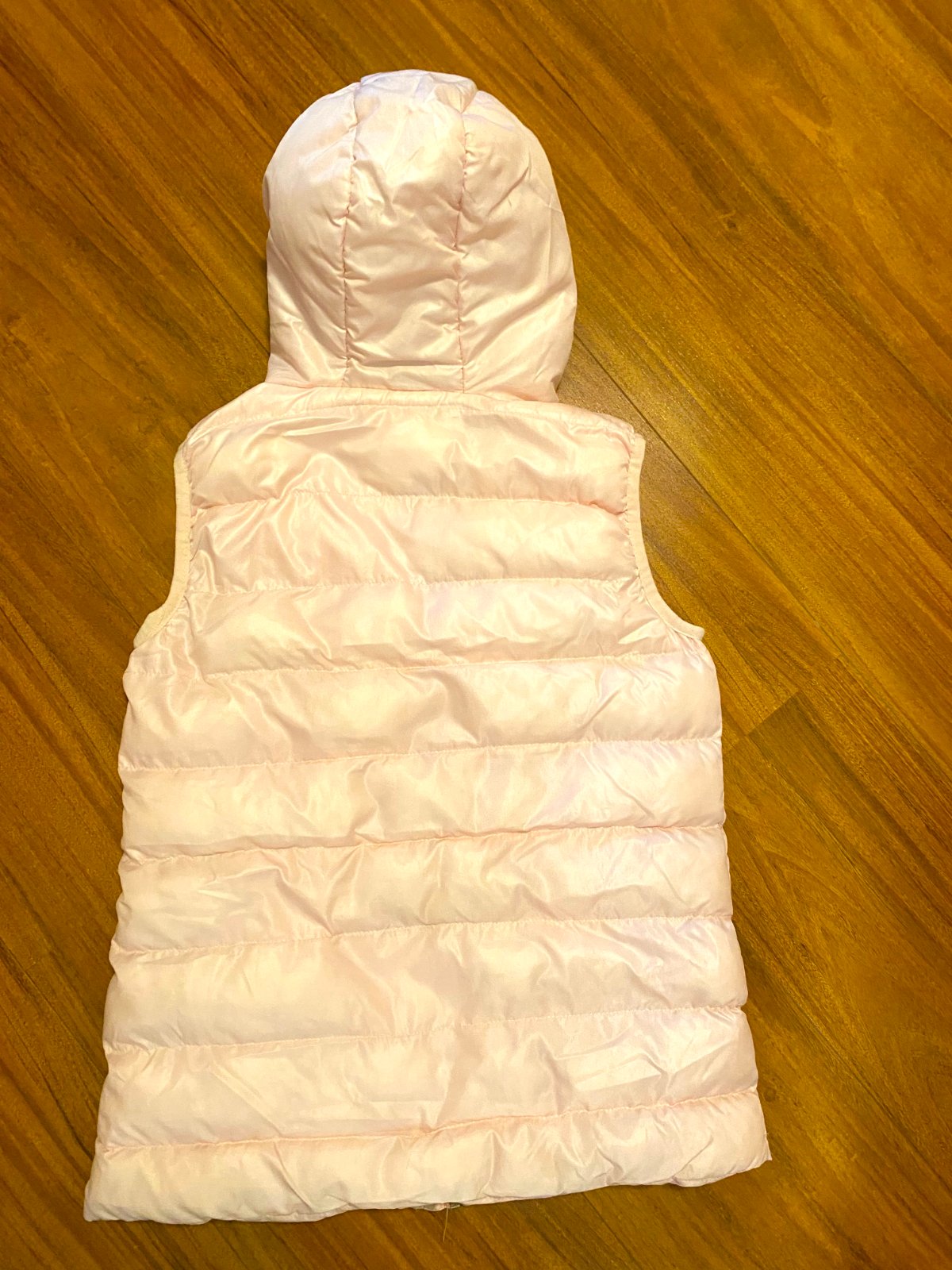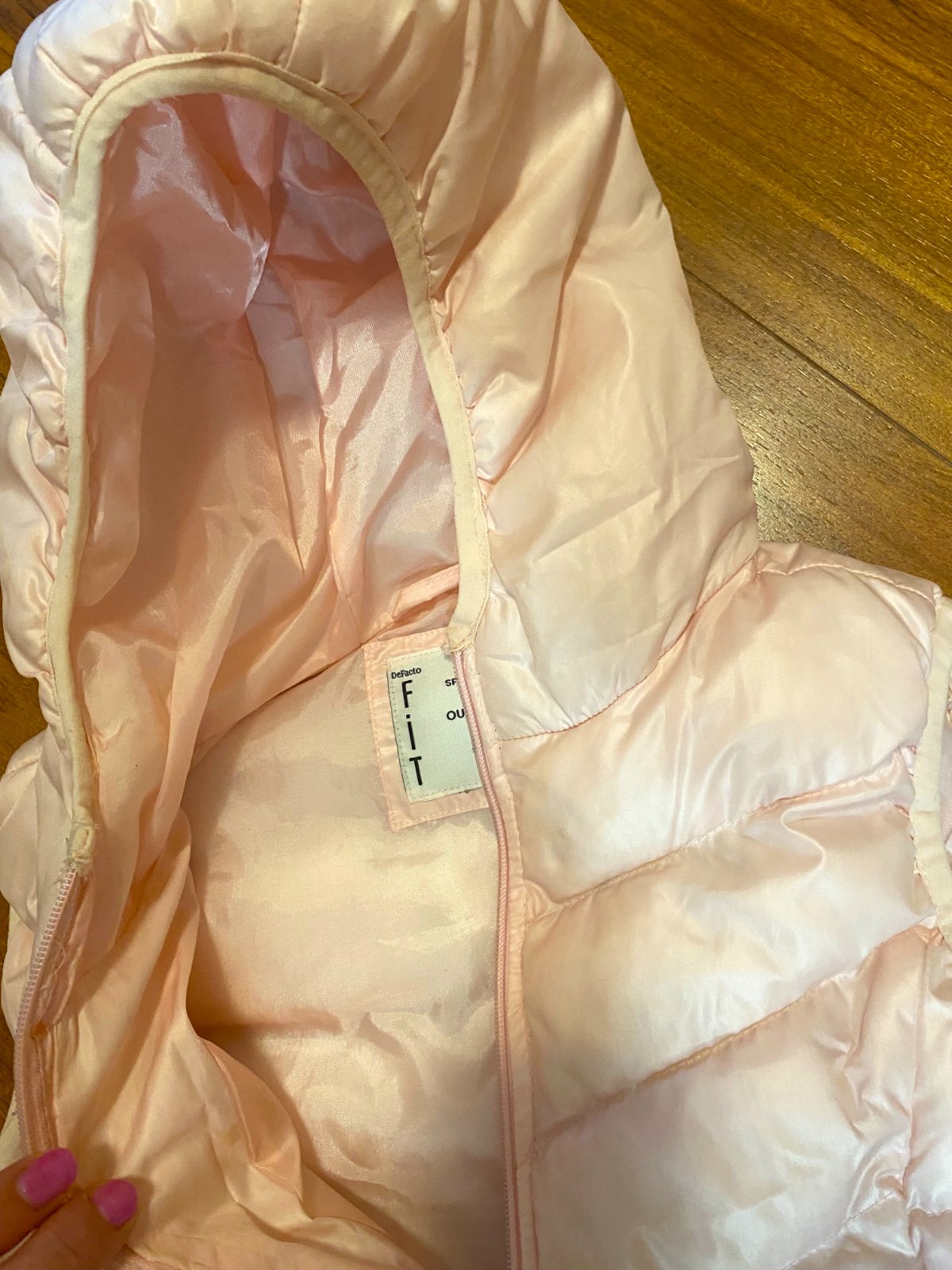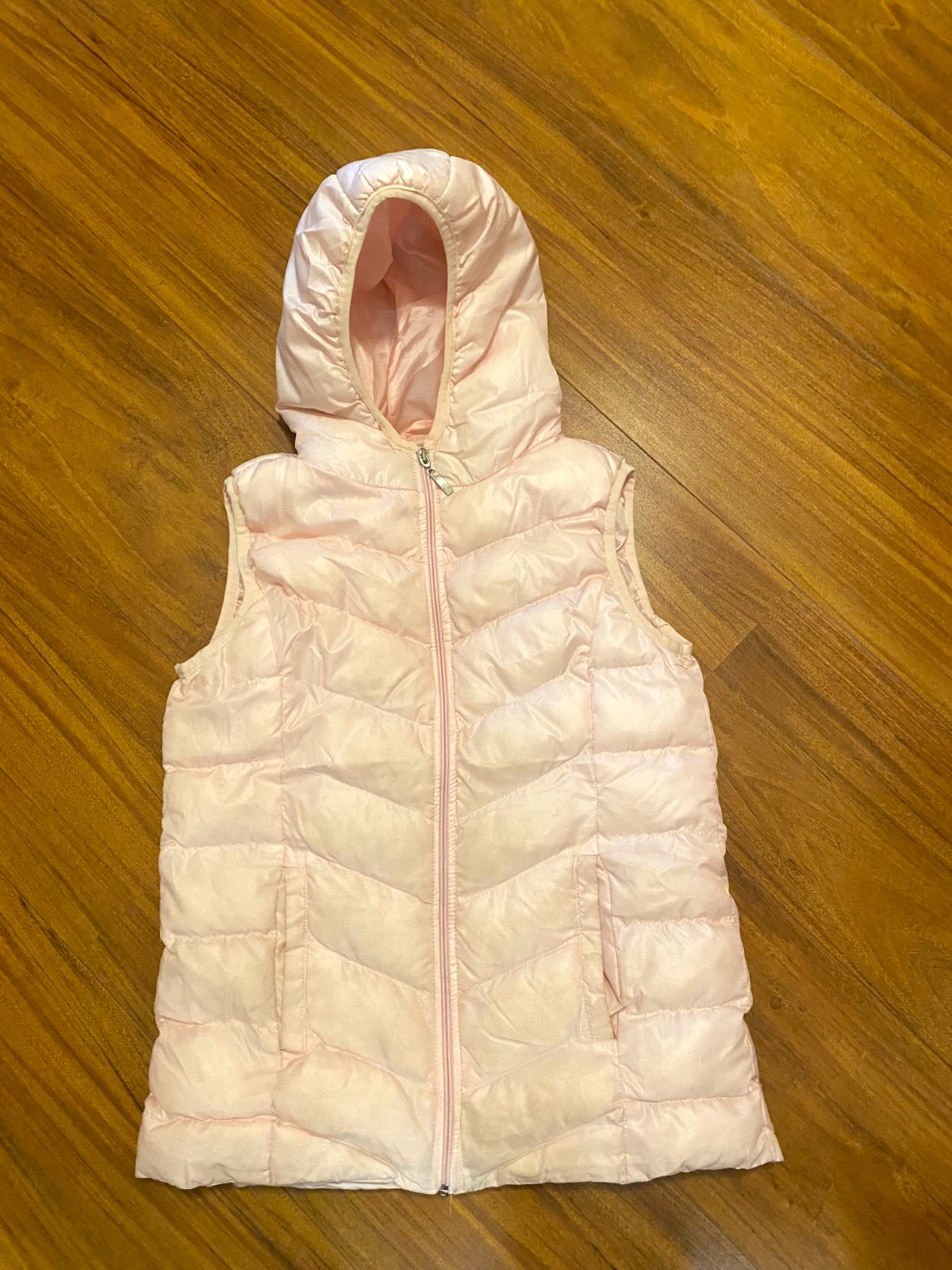 Dievčenská zateplená vesta s kapucňou, v bledo ružovej farbe, veľkosť na 12-13 rokov, 152-156 cm.
