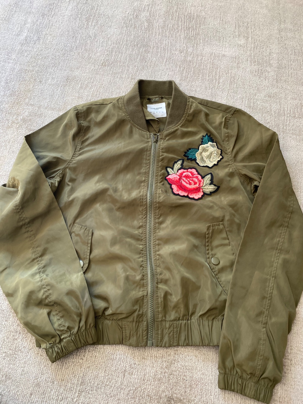 Vero moda krátka bunda, zapínanie na zips, prechodná skôr teplejšia, material podobný flaušovine, rozmery: dl.-54 cm, š.-2x 42 cm, dl.rukáva od ramena 62 cm
