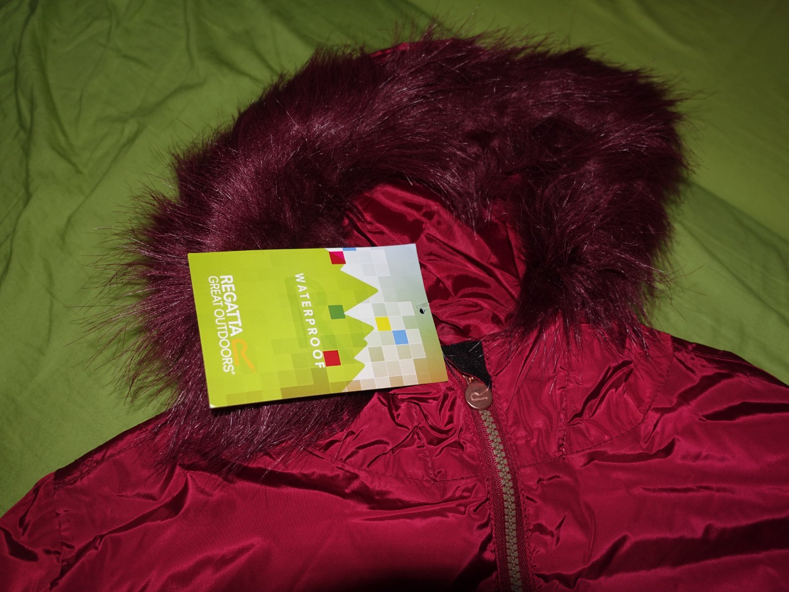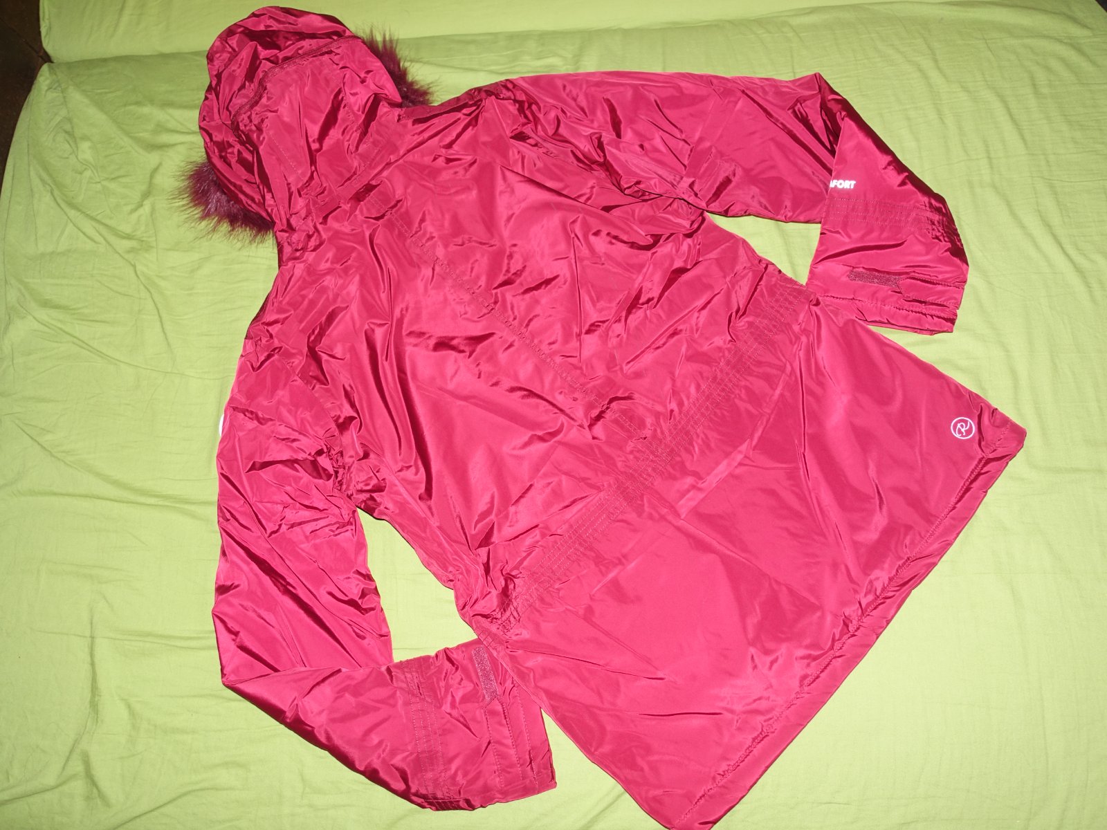 Krasna zimna bunda- nova, s visackami. Kapucna sa da odopnut. Je original.