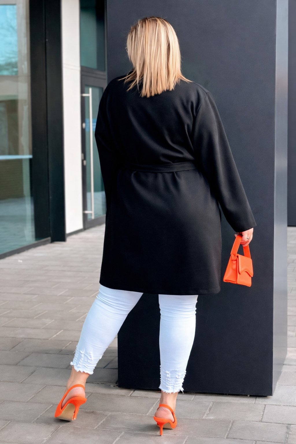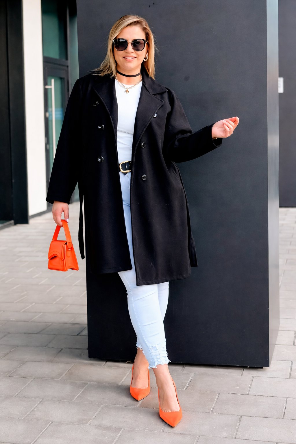 Kabát zaujme svojím nadčasovým dvojradovým strihom, ktorý pôsobí upravene, žensky a moderne. Čierna farba je klasika, ktorá sa veľmi ľahko kombinuje s ďalšími kúskami oblečenia – výborne vyzerá s rifľami, nohavicami, šatami aj elegantnou obuvou. Vďaka tomu je tento elegantný plus size kabát vhodný na bežné nosenie, do práce, do mesta aj na stretnutia.