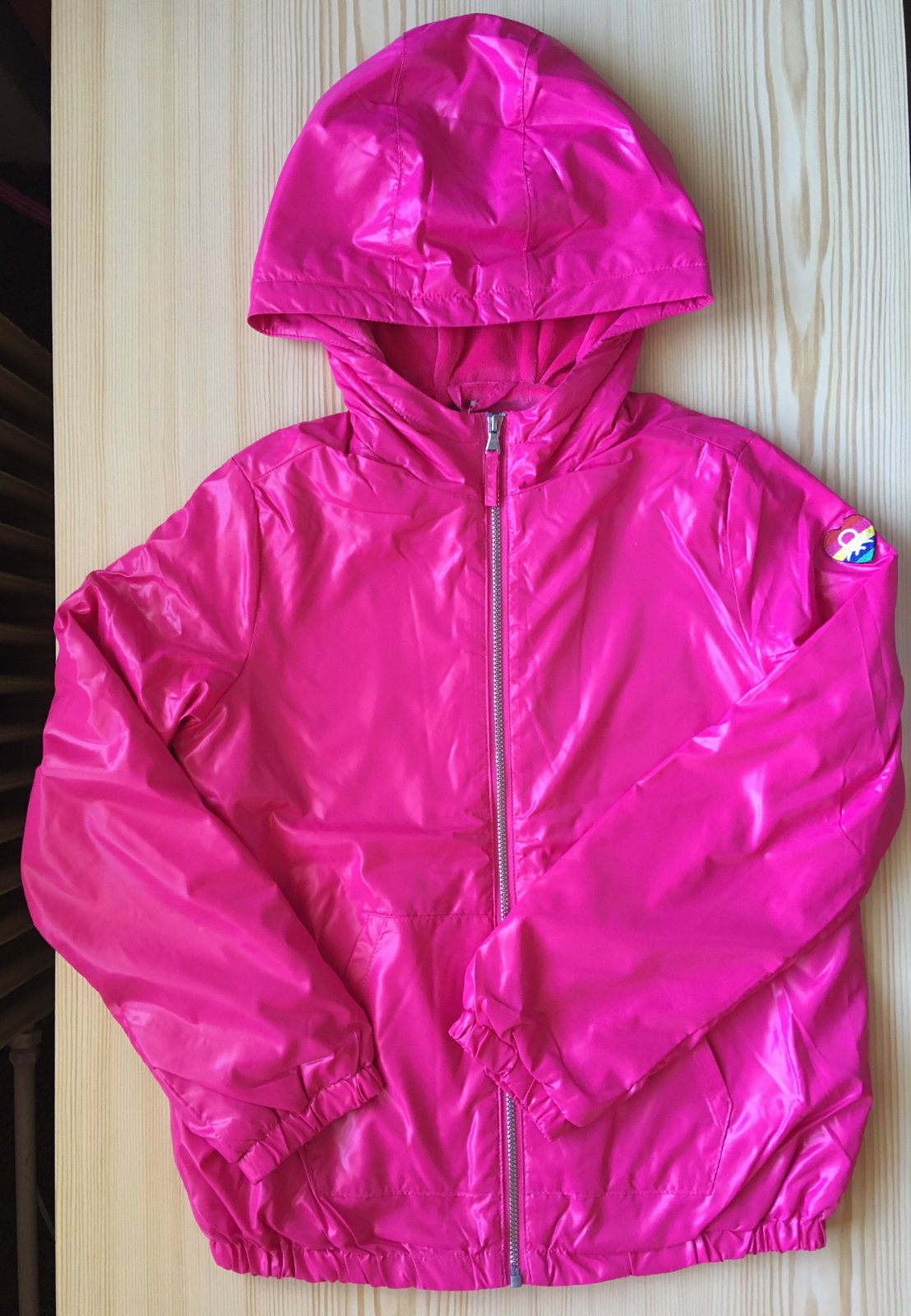 Nová, ešte s visačkou. Extra ľahká cyklámenovo ružová prechodná vetrovka značky Benetton vo veľkosti 140. Z vonkajšej strany lesklá, z vnútornej strany zamatová.