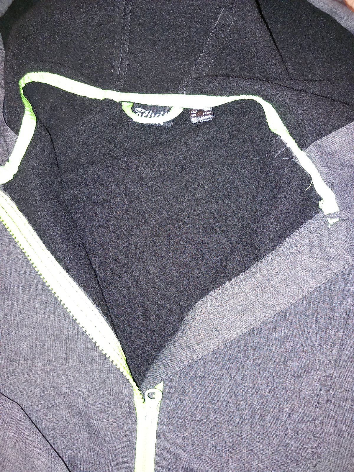 Vetrovka má flísovú vložku, ktorá sa dá odzipsovať a vznikna rak mikina a vetrovka - viď foto. V golieri je zrolovaná kapucňa. Bez poškodení. Dĺžka 50cm, šírka cez hrudník 43 cm, rukáv 47cm.