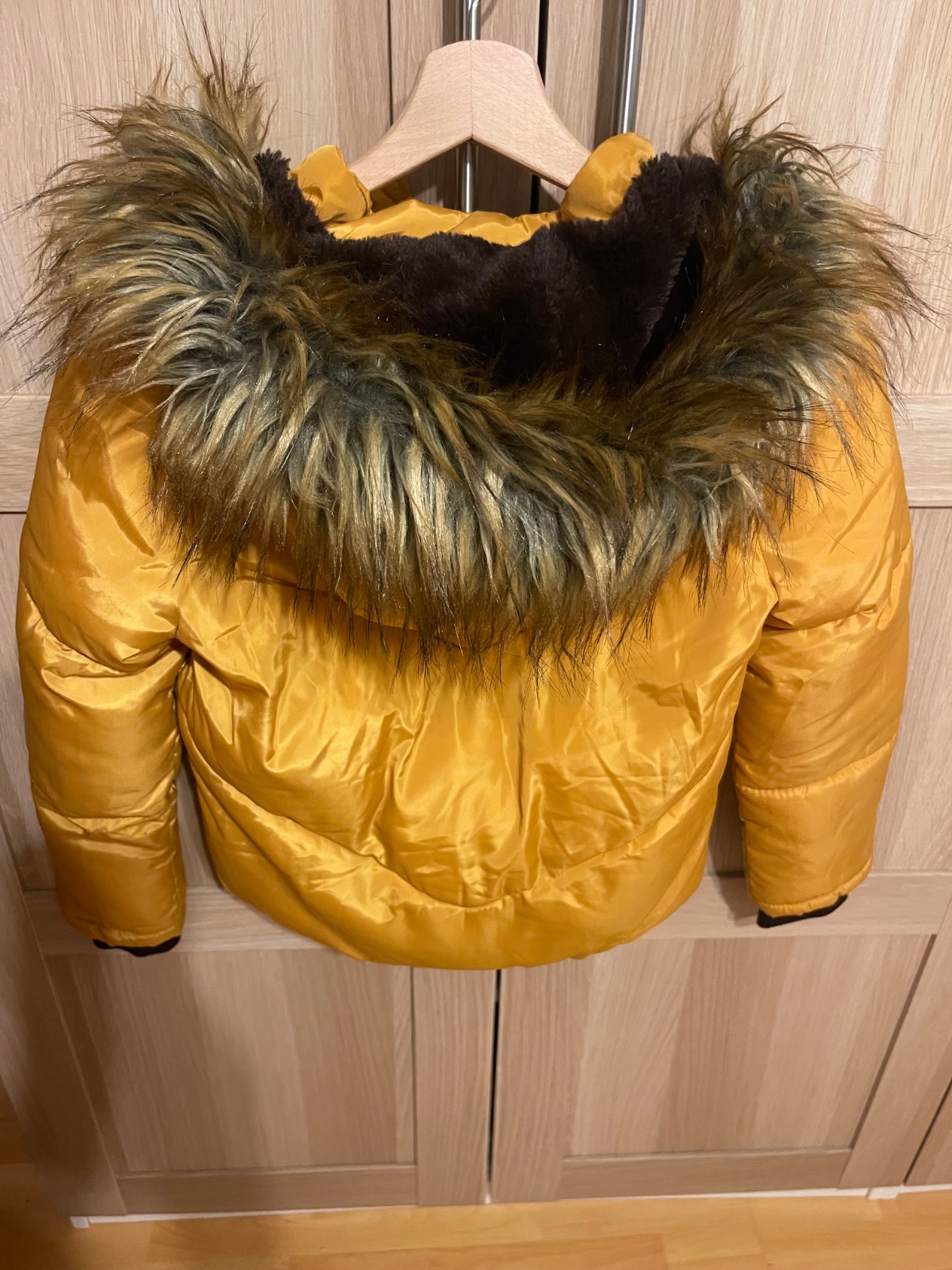 Krásna bunda v top stave, vhodná na studenú jeseň alebo slabšiu zimu. Dĺžka od krku 46 cm. Obvod 2x 44 cm. Dĺžka rukáva od krku 60 cm. Kapucňa je na pevno.