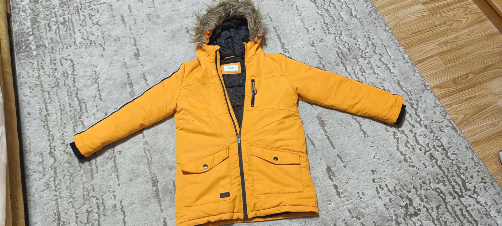 Bunda je poriadne hrubá, fakt do studenej zimy, podšitá flísom, v spodnej časti vo vnútri je snežný pás na zapnutie, kapucňa sa dá odoponúť, na zips, reflexné prvky. Má už pár fliačikov, na pravom ...