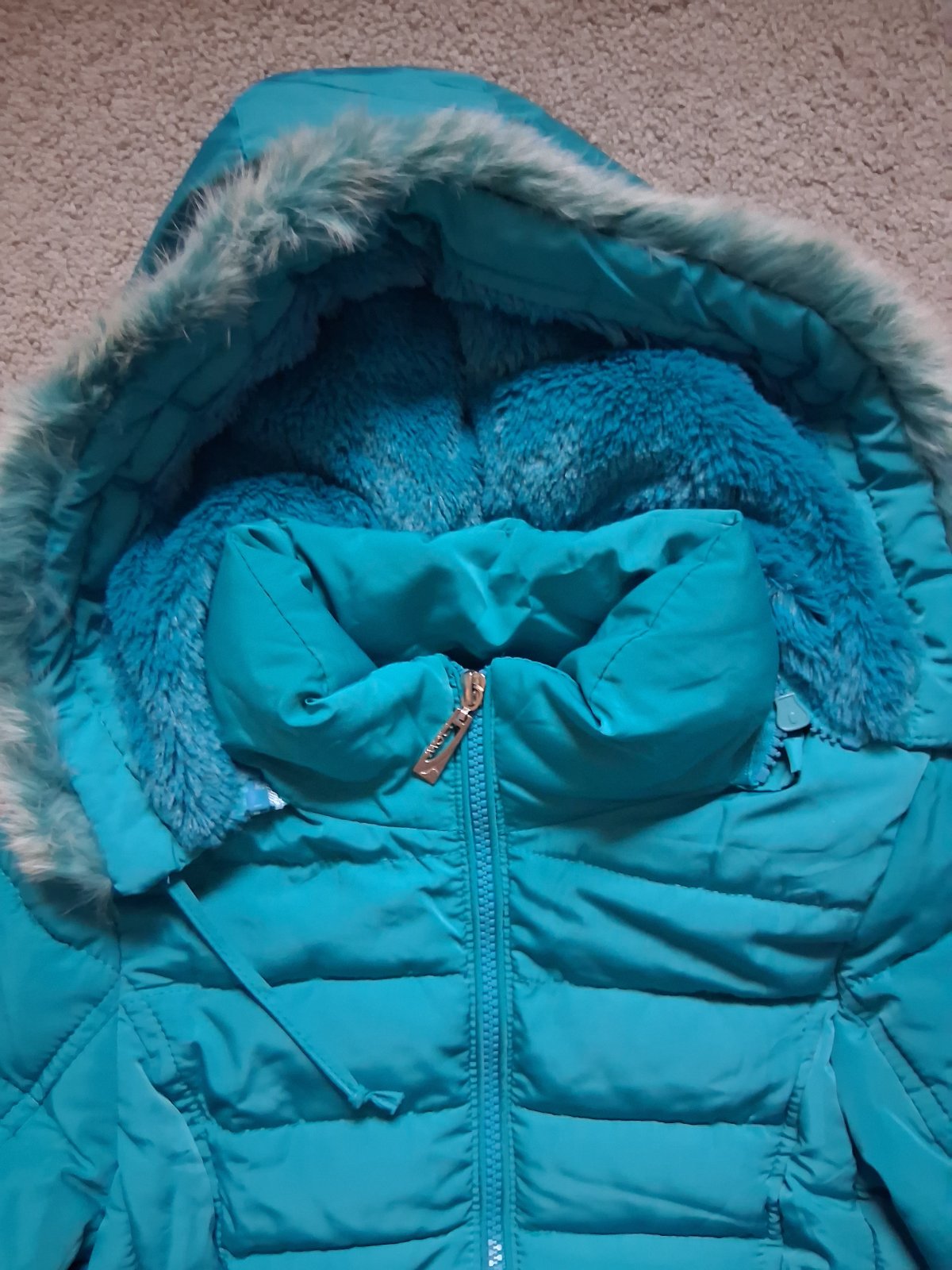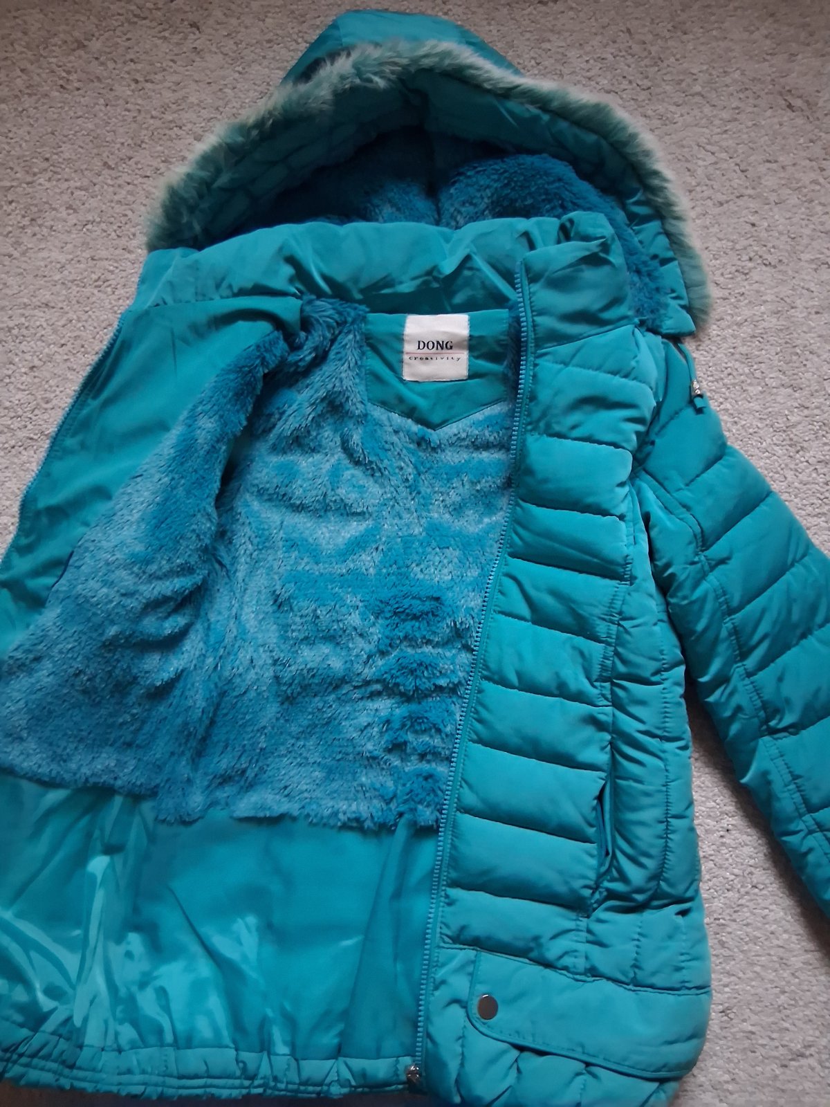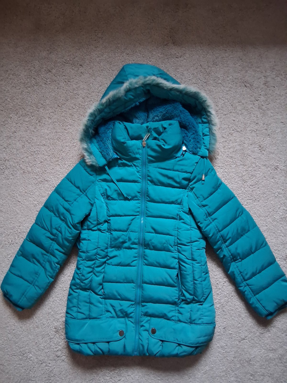 Nosená jednu zimu na striedačku s inými vetrovkami, takže je v super stave. Odhadujem veľkosť na 128-134. Dlžka 61cm, šírka pod pazuchami 2x38cm. Dĺžka rukáva od pleca 47cm+ 2cm patent. Krásna zelená farba.