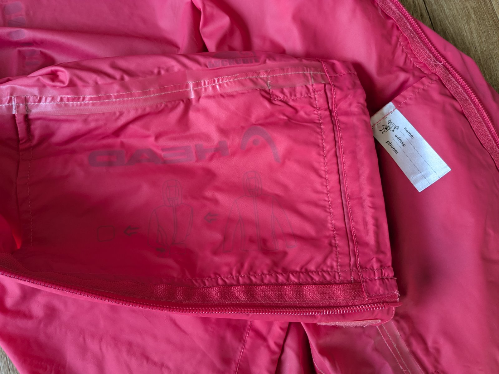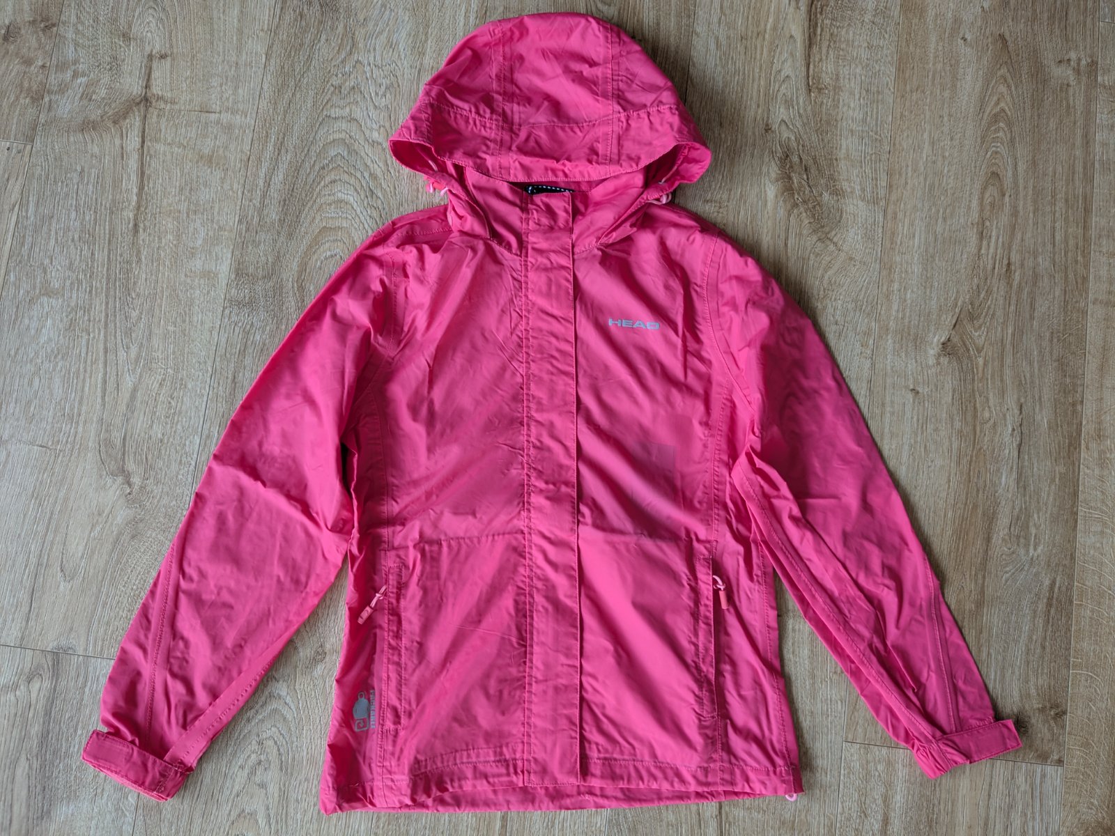 Ľahká nepremokavá bunda, reflexné prvky, v dolnom okraji sťahovacia šnúrka, možnosť regulácie dolného okraja rukávov, ľahko sa dá zbaliť do malých rozmerov, zmestí sa tak do každého batôžka, dvojčíslie 140-146. Farba medzi tmavoružovou a červenou.