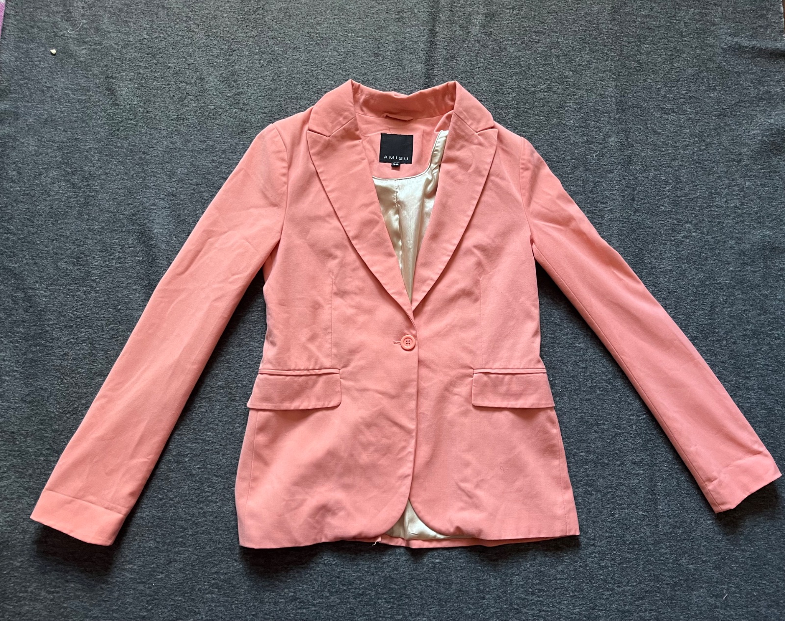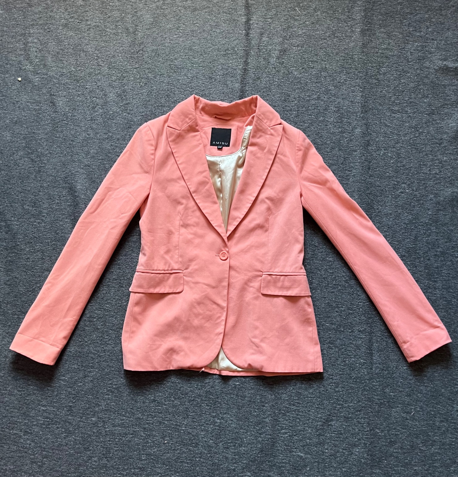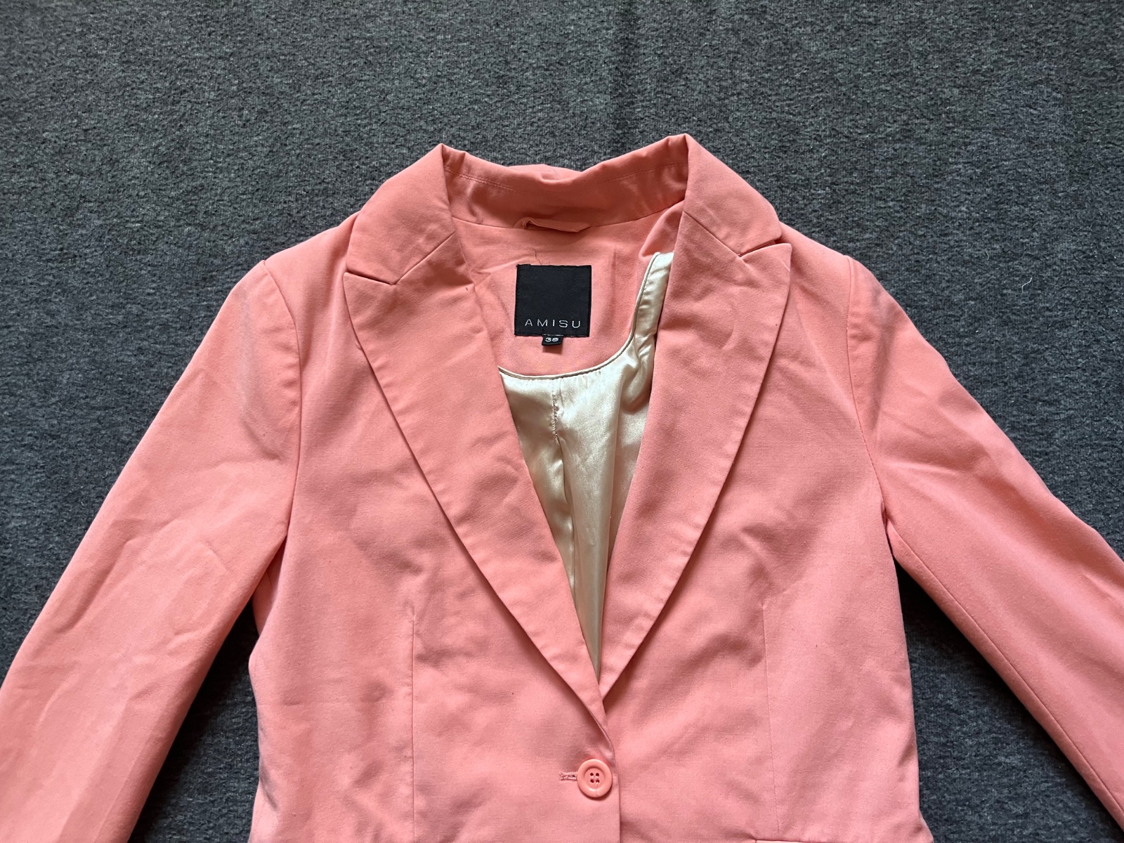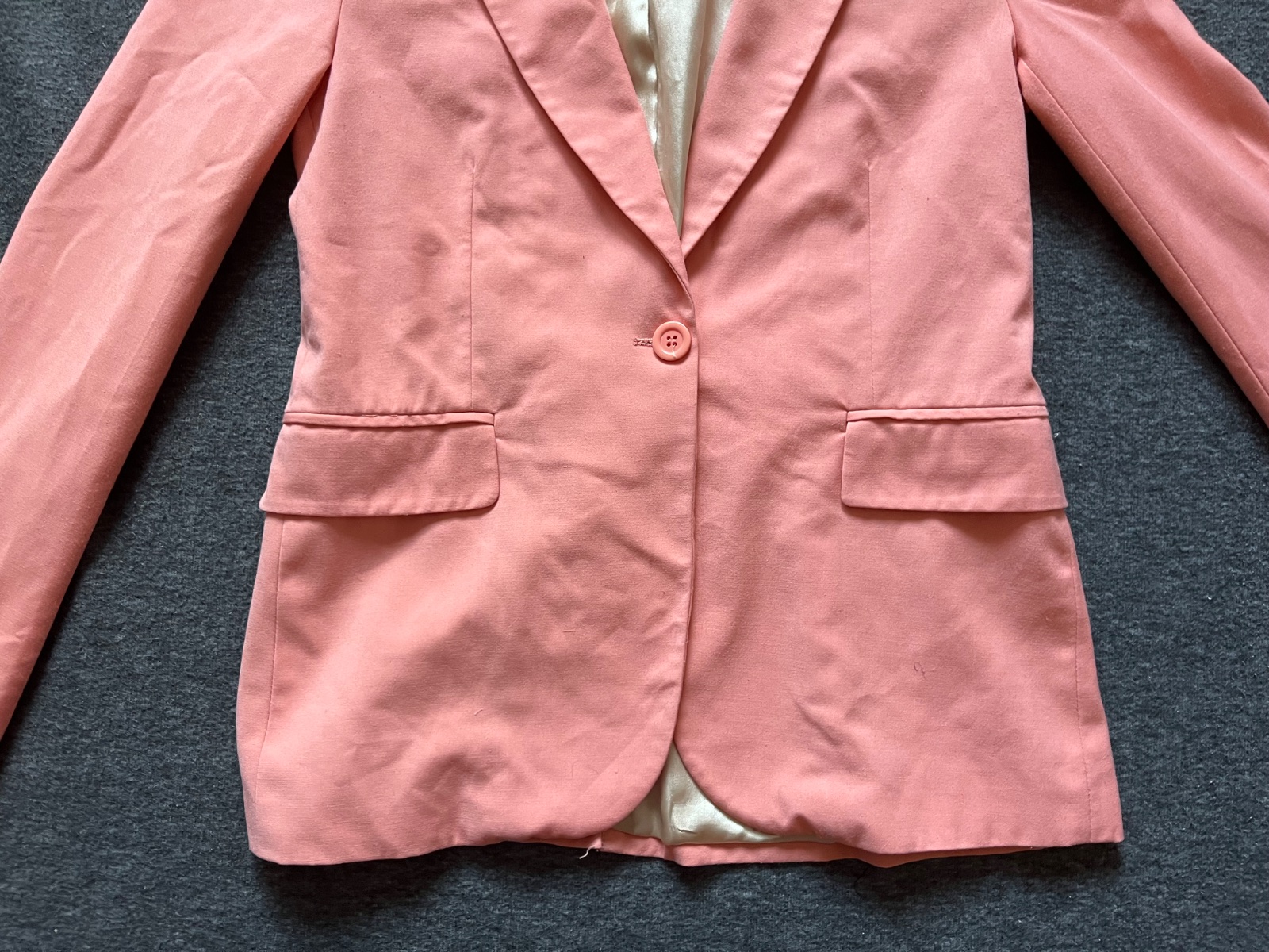 Asi 2x oblečené dámske sako lososové farby, podšité. Top stav. Veľkosť S. Dĺžka cca 65cm, šírka pod pazuchou cca 2x43cm, dĺžka rukavu cca 63,5cm.
