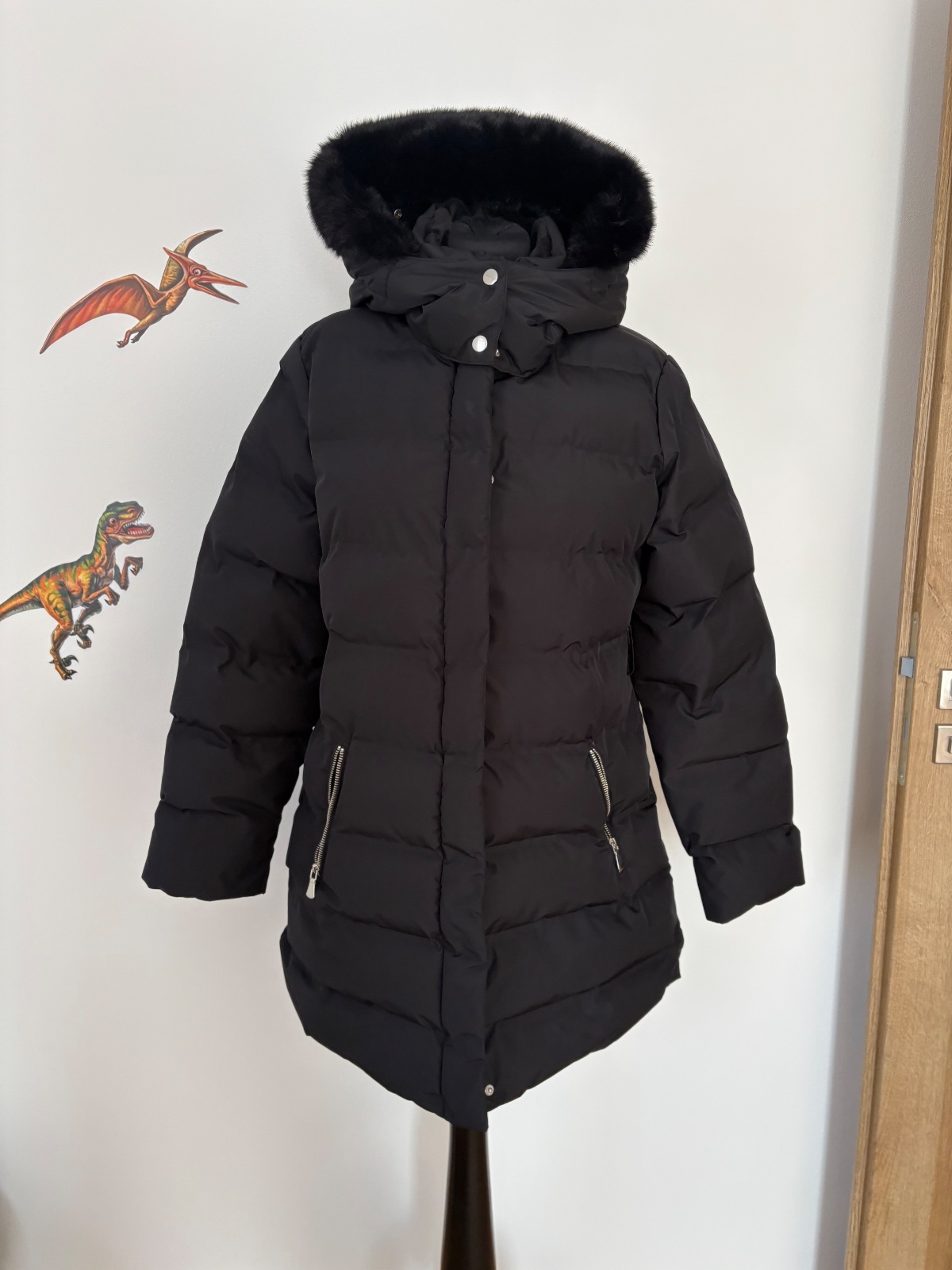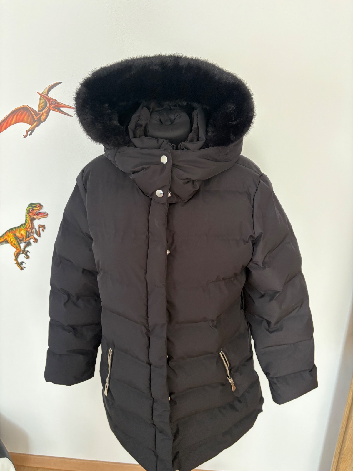 Krásna teplá zimná bundička s odnímateľnou kapucňou, kožušina sa nedá odpraviť. Celková dĺžka 63 cm, šírka 46 cm.