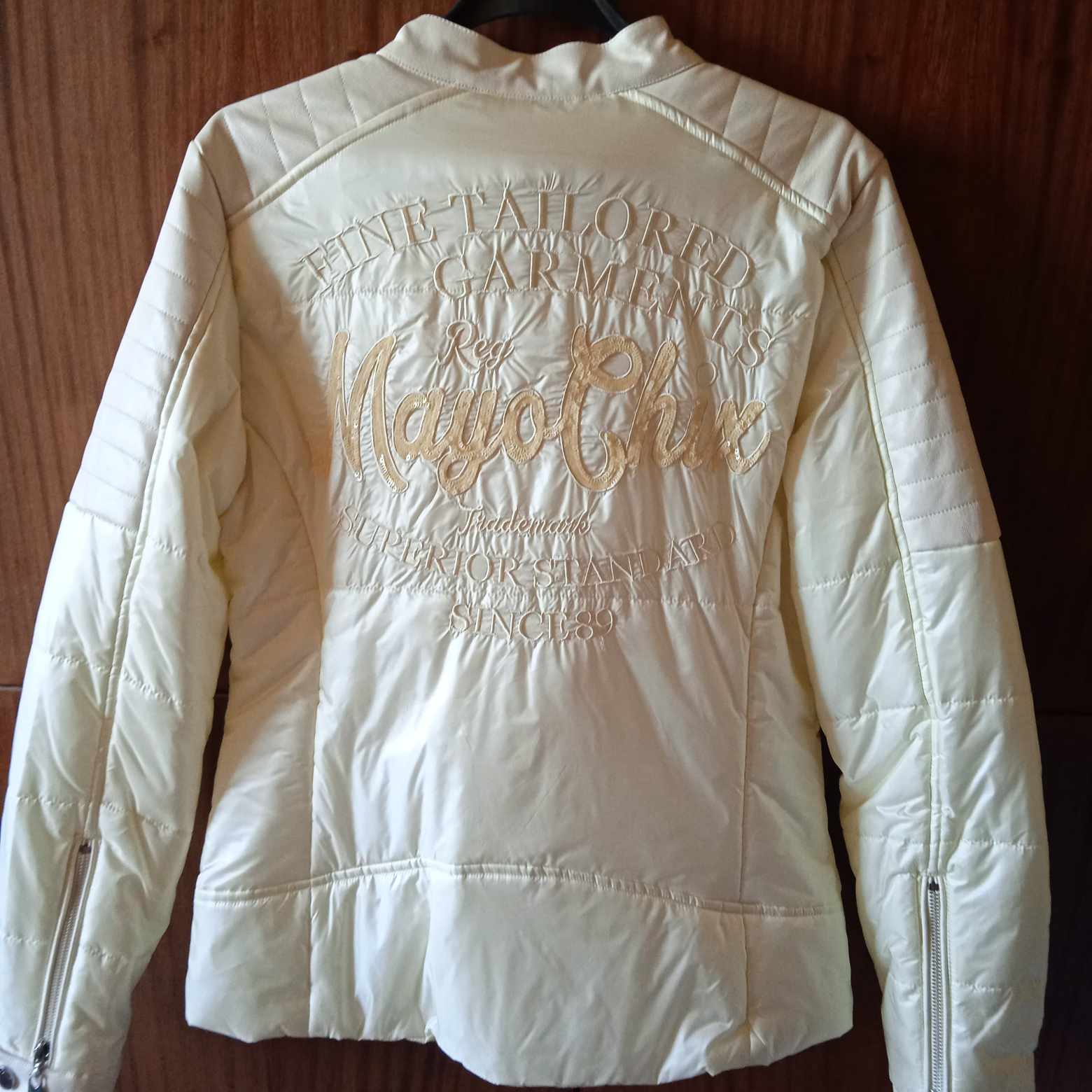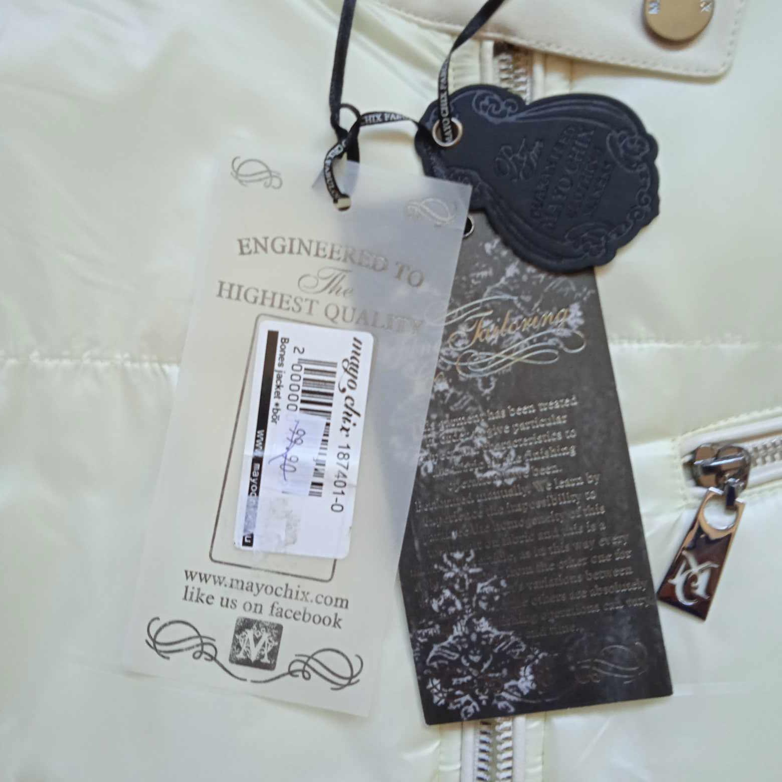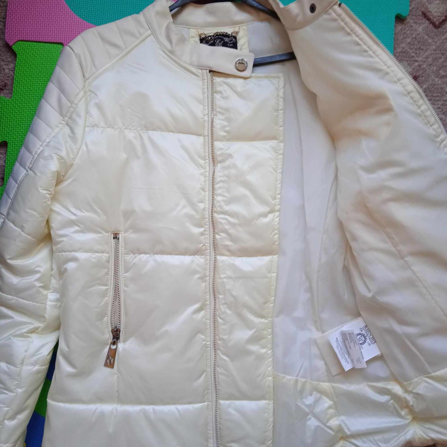 Ani raz neoblečená, nakoľko mi je veľká. Kupovaná v akcii z pôvodných 150€ za 99,90€. vid visačka. Farba taká slonovinová. Plecia a boky rúk koža. ľahučká na prechod. Chrbát všité ,,bliskáčové" logo. Rukáv na gombík plus zips. Pripadá mi ako motorkárska do pása. Rozmery: dĺžka od pleca- 62cm, šírka pod prsiami- 2x45cm, chrbát- 2x 40cm, rukáv od pleca- 62cm.