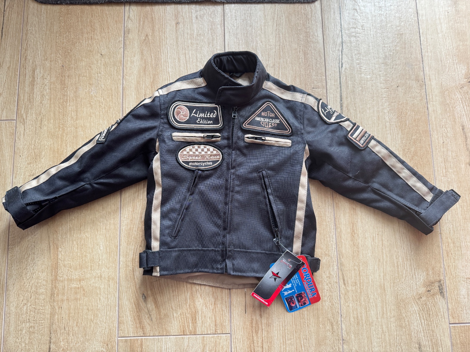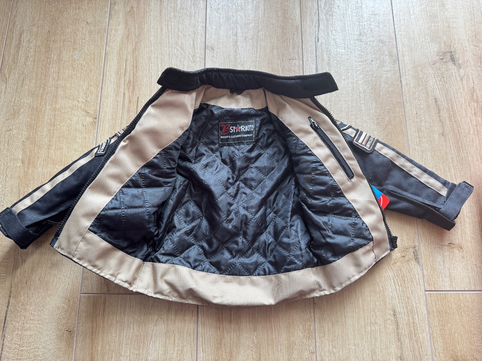 Štýlová detská moto bunda v čierno-béžovej farbe, veľmi pekné spracovanie.