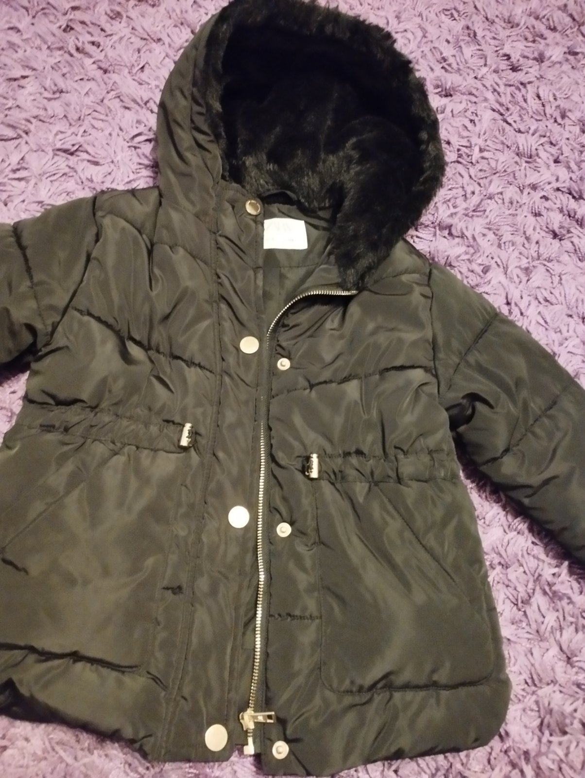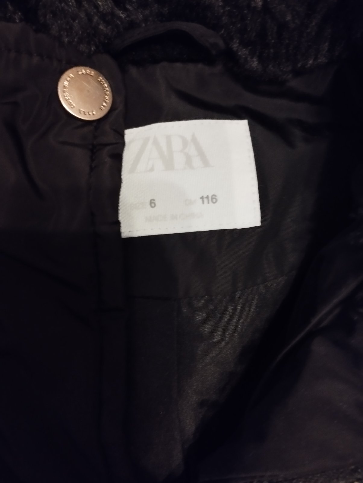 Čierna bunda vidiet známky opotrebenia veľkosť 118 na 5-6 rokov s kapucňou značky Zara