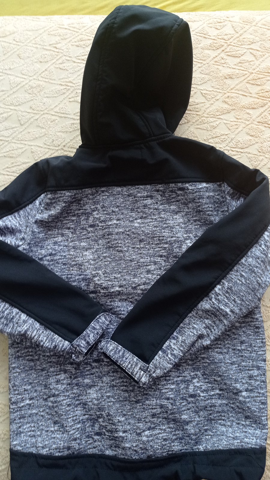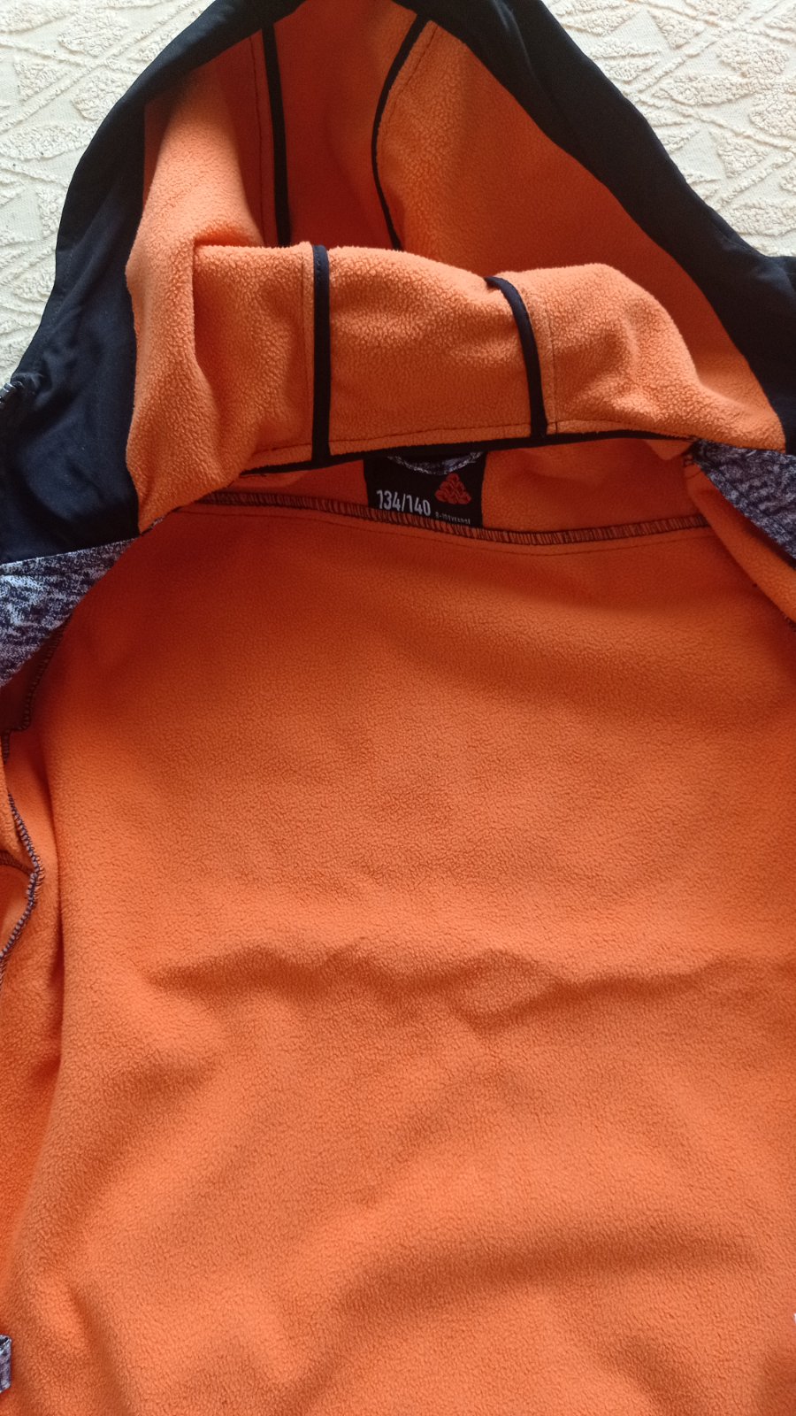 nosená, ošúchané rukávy, vrecká, olupuje sa oranžová nažehľovačka, pre nenáročnú maminku, na donosenie, na dvor ešte poslúži, zips je ok