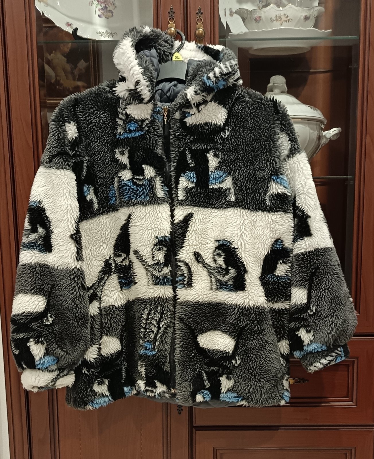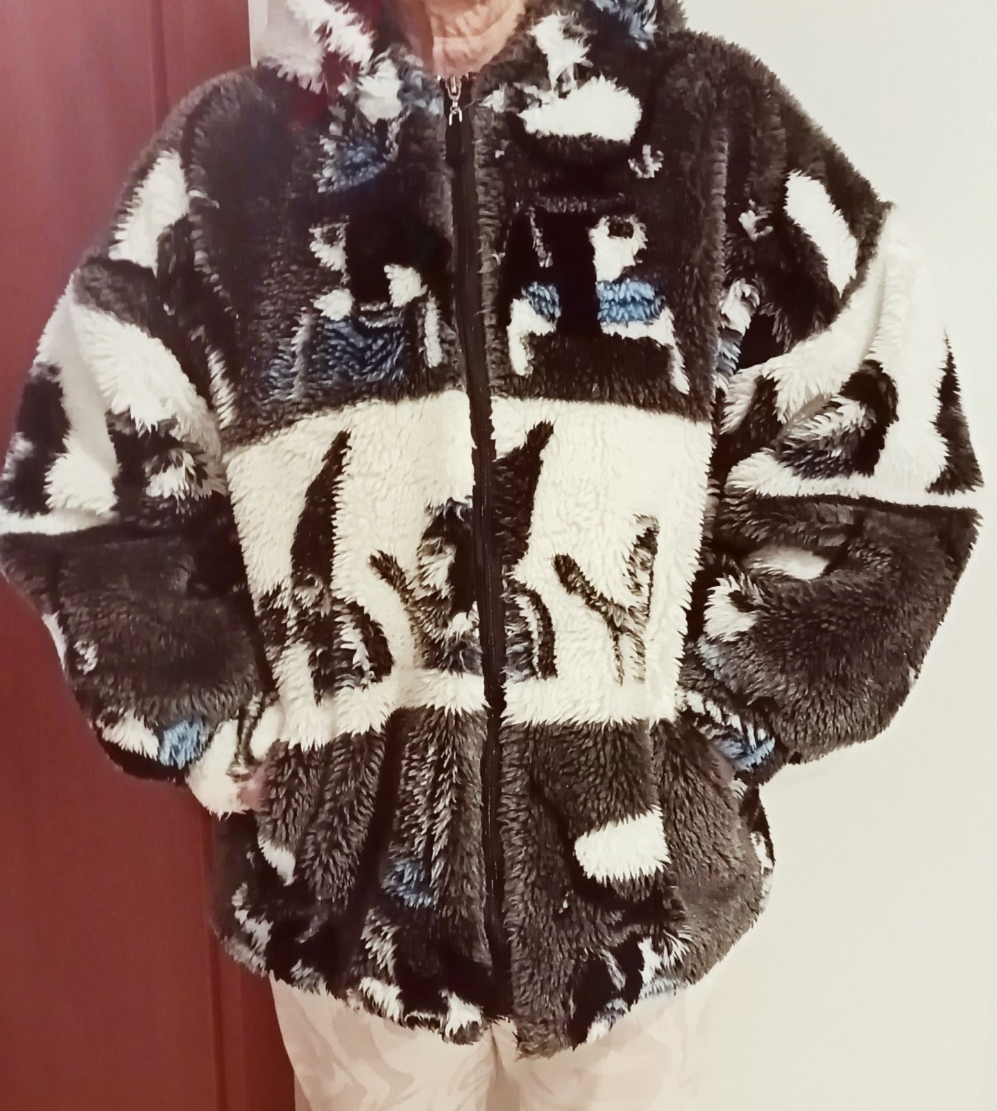 Top kúsok, krásna teplučká huňatá bundička, mierne paletková so vzorom, farby: smotanová, tmavošedá a bledo modrá, vnútro zateplené, bočné vrecká, široké rukávy do manžety, dobre sa perie a rýchlo schne, super stav.