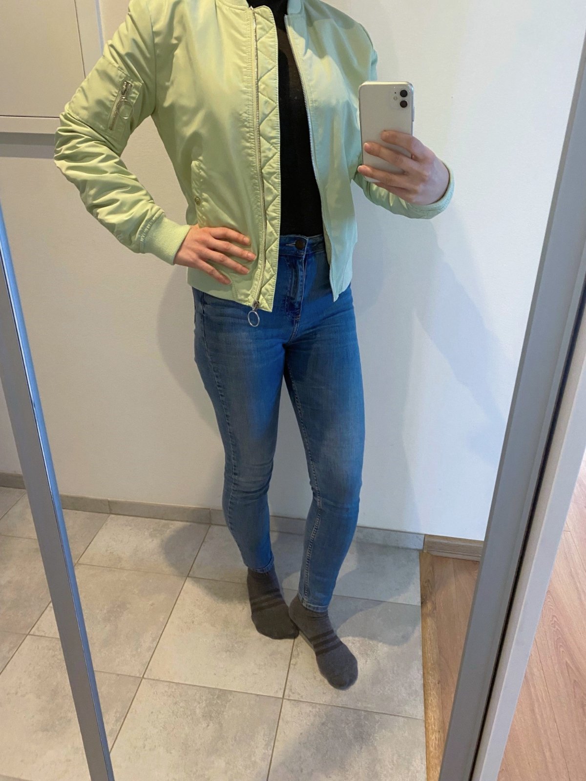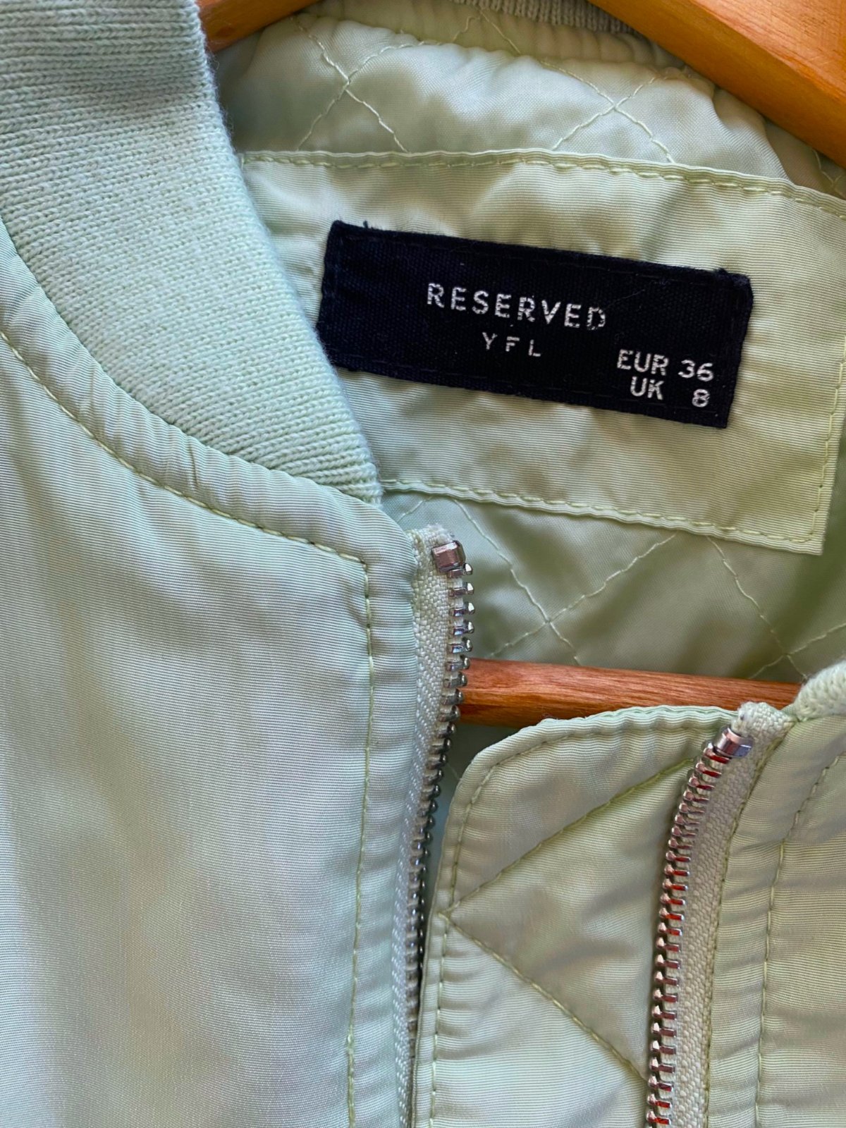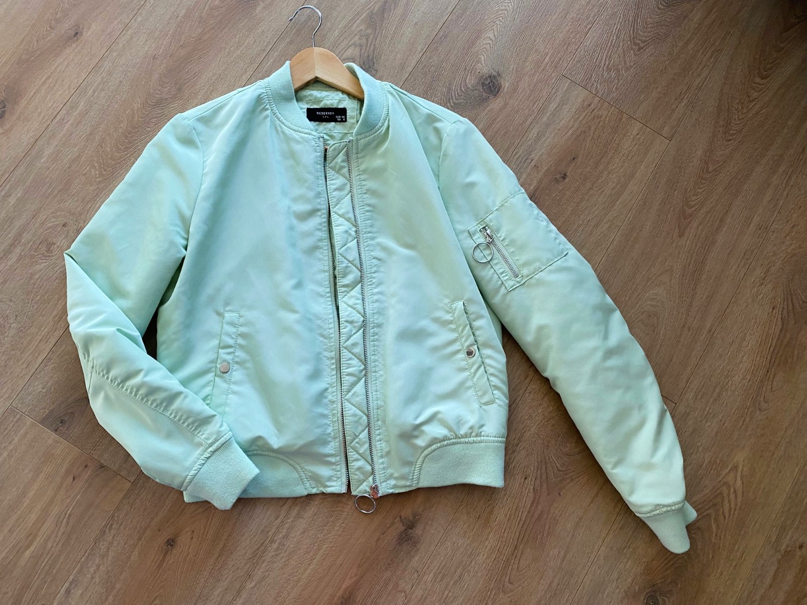 pár krát oblečená bombera vo veľmi peknom stave. Z vnútornej strany je prešívaná, nie je zateplená. Farba je svetlozelená až mätová (reálna farba zodpovedá na prvých dvoch foto).